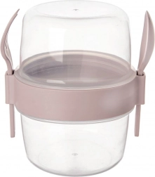 Lonček je izdelan iz kakovostne, odporne plastike brez BPA, primeren je za pomivanje v pomivalnem stroju, zamrzovanje in segrevanje v mikrovalovni pečici brez pokrova. Tesnilni pokrov preprečuje iztekanje, zaradi praktičnega držala pa boste imeli žličko in vilico vedno pri roki. Kompaktne mere se prilegajo večini torb, nahrbtnikov in lunchboxov – popoln sopotnik na poti.