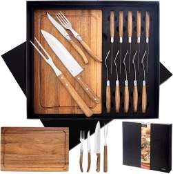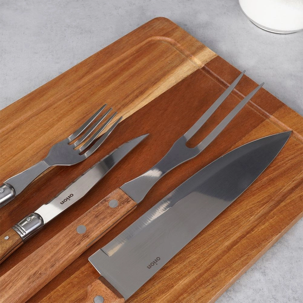 Del kompleta je robustna deska iz akacijevega lesa za rezanje in serviranje. Komplet je shranjen v elegantni darilni škatli, zato je odlično darilo. Uporabljali ga boste doma, ob žaru in v HoReCa okoljih.