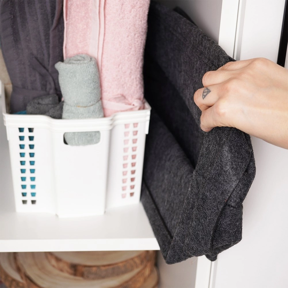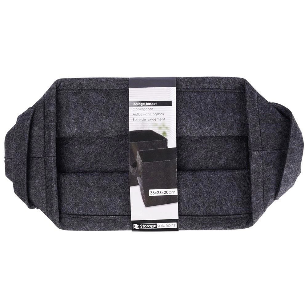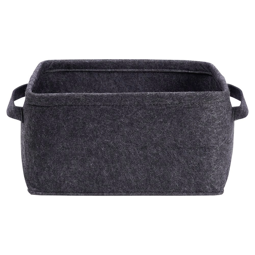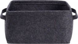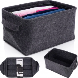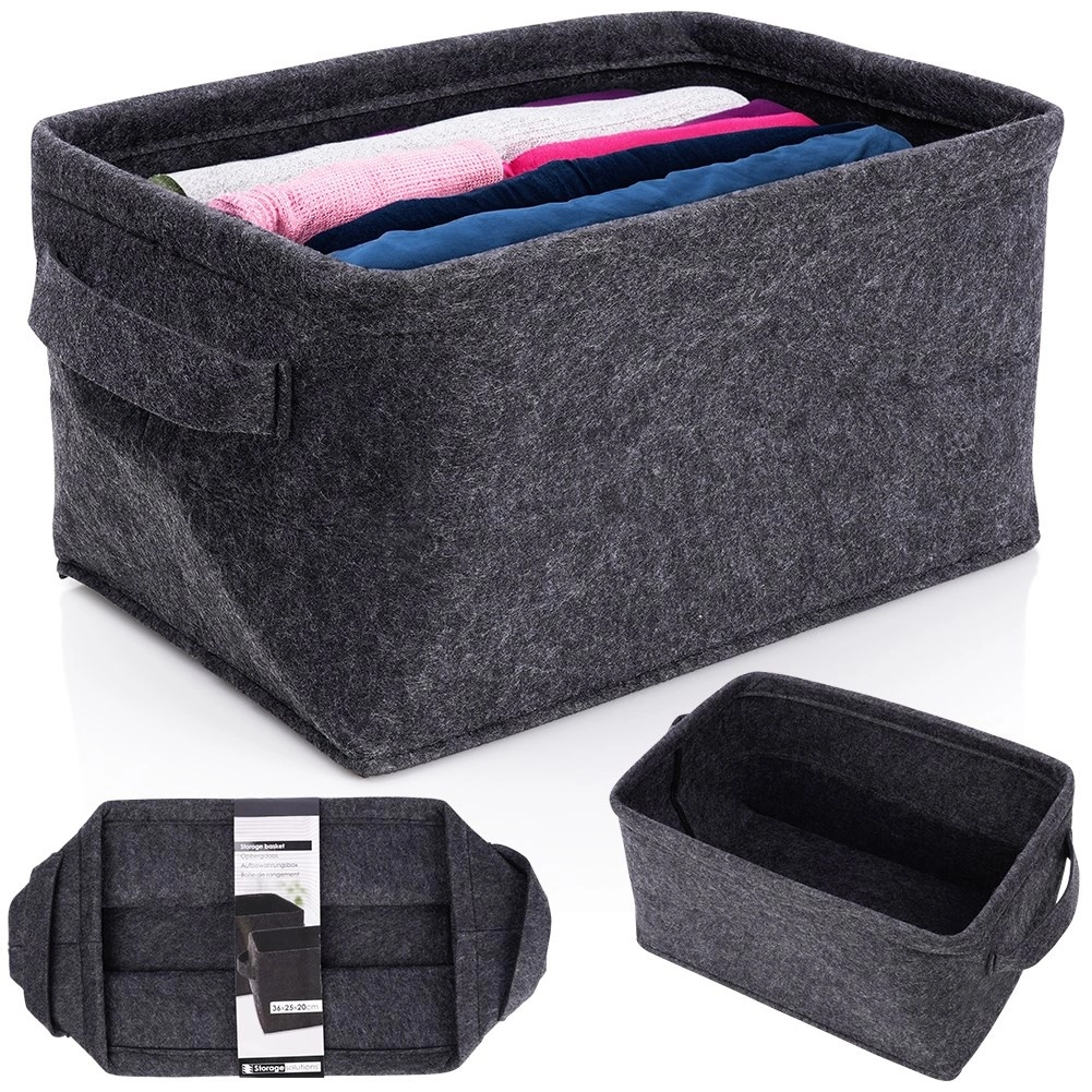 Ta zložljiva filcna košara z merami 36 × 27 × 20 cm je odlična izbira za pregledno shranjevanje tekstila, igrač, dodatkov in pisarniških potrebščin. Zahvaljujoč čvrsti in debeli filcni tkanini drži obliko, hkrati pa je lahka in enostavna za prenašanje.