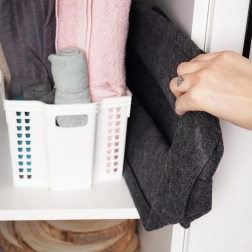 Sodoben, čist videz v črni barvi se poda v dnevno sobo, spalnico, otroško sobo in kopalnico. Zložljiva izvedba omogoča, da košaro v hipu zložite na ravno in prihranite prostor, ko je ne potrebujete.