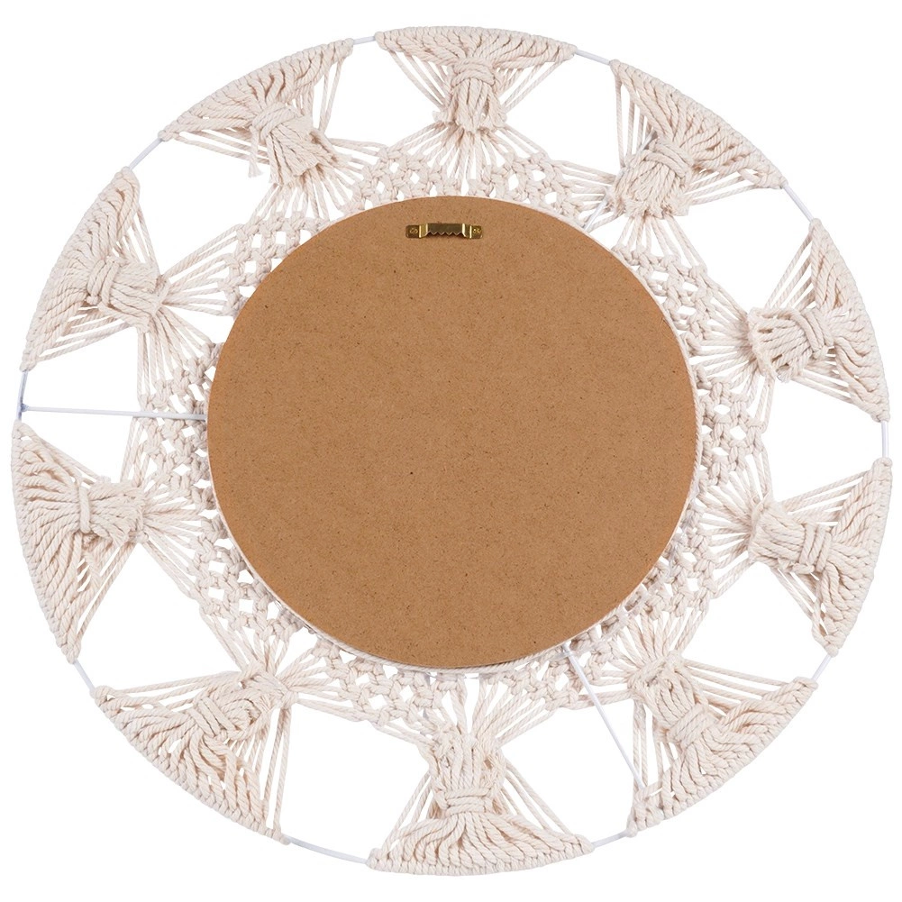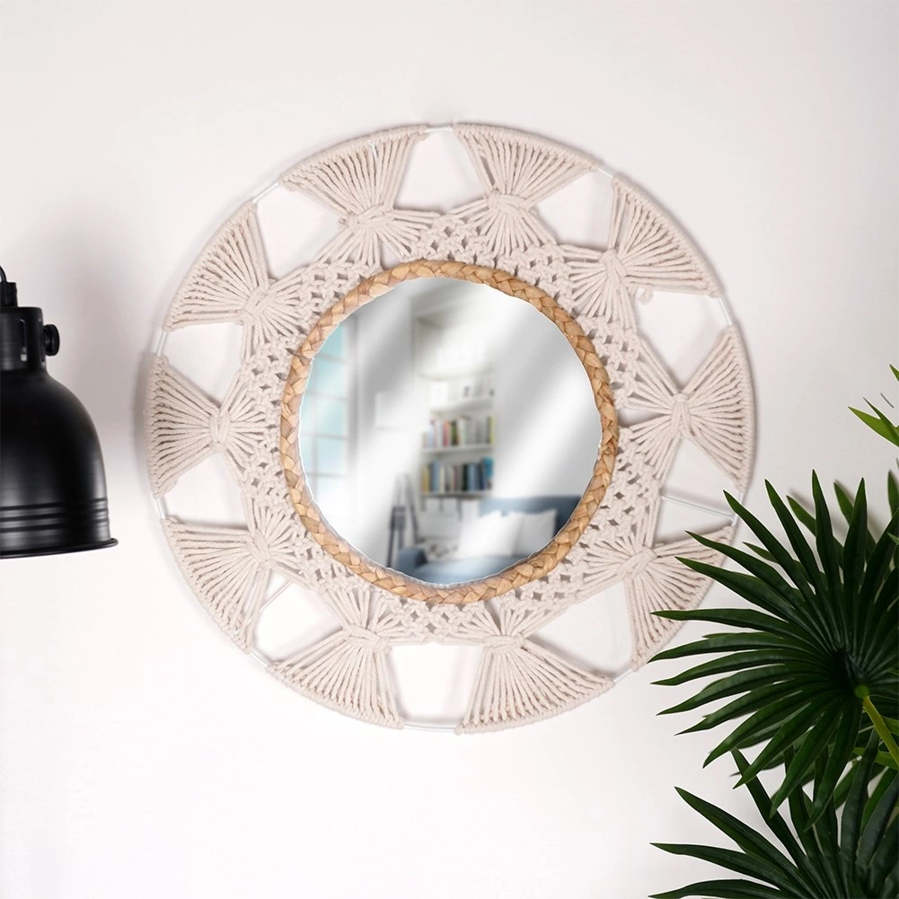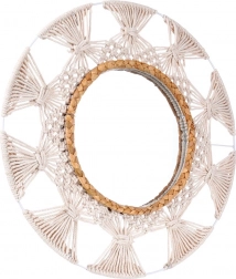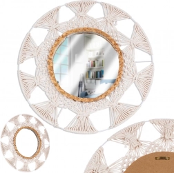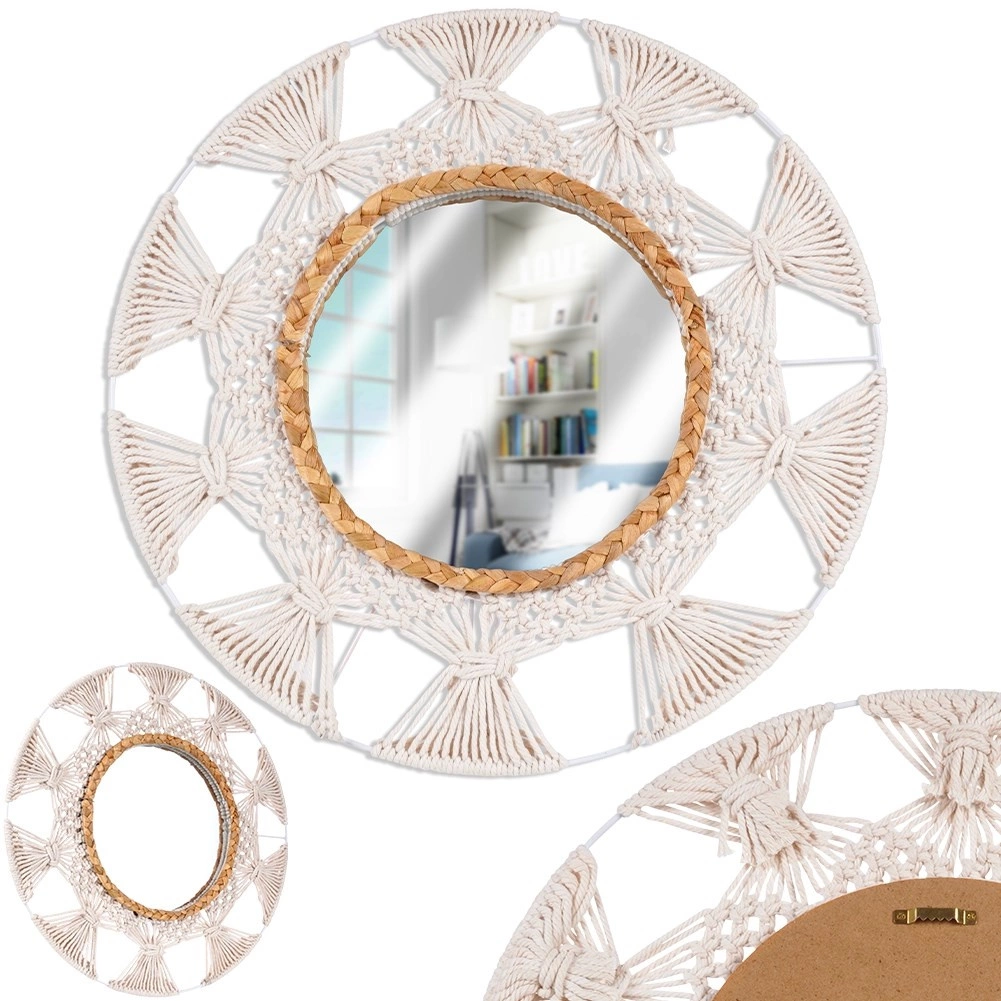 V svoj dom vnesite lahkotnost in toplino z okroglim ogledalom v priljubljenem boho slogu. Kombinacija bež bombažnega pletenja, ki spominja na makrame, ter dekorativnega prstana iz morske trave ustvari edinstven poudarek na steni. Ogledalo nudi oster in naraven prikaz ter deluje kot praktična in dekorativna dominantna dekoracija.
