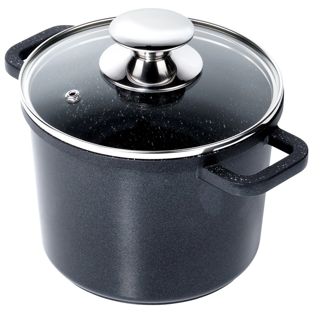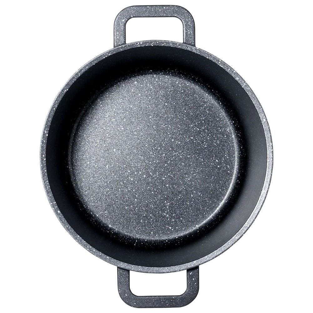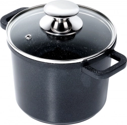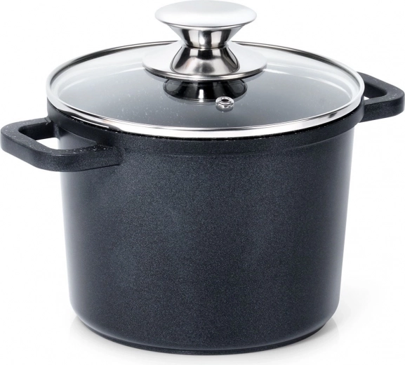 Eleganten lonec iz črnega aluminija z notranjo granitno neprijemljivo površinsko obdelavo PFLUON zagotavlja, da se hrana ne prismodi, lažje se čisti in ohrani naraven okus ter hranila. Stekleni pokrov z odprtino za izpust pare omogoča nadzor kuhanja brez nepotrebnega dvigovanja.