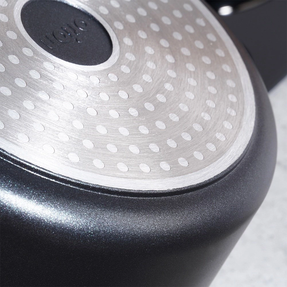 Hitro in enakomerno segrevanje prihrani energijo. Primerno za plin, elektriko, keramiko, halogen in indukcijo; možnost uporabe v pečici (pokrov do 200 °C).