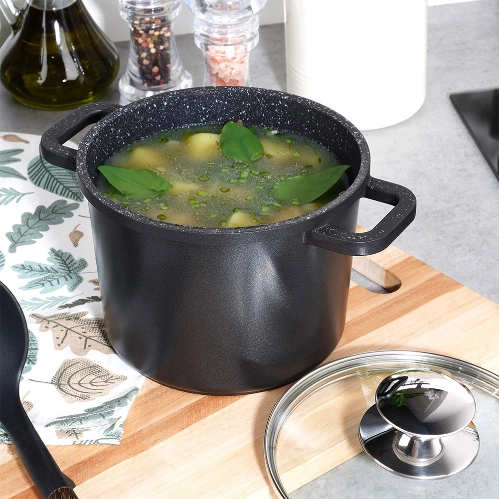 Zaradi hitrega in enakomernega segrevanja je idealen za juhe, omake in enolončnice/one-pot jedi. Lonec je univerzalen – za plin, elektriko, keramiko, halogen in indukcijo, uporabite ga lahko tudi v pečici (pokrov do 200 °C). Udobni ročaji olajšajo rokovanje, po kuhanju ga preprosto operete v pomivalnem stroju.
