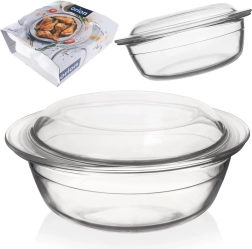 Univerzalna steklena ognjevarna posoda s pokrovom s prostornino 1,5 l za pečenje, gratiniranje in serviranje. Izdelana iz odpornega borosilikatnega stekla, primerna za pečico, mikrovalovko, pomivalni stroj, hladilnik in zamrzovalnik. Dve posodi lahko uporabljate posamezno ali skupaj kot posoda + pokrov za ohranjanje sočnosti jedi.