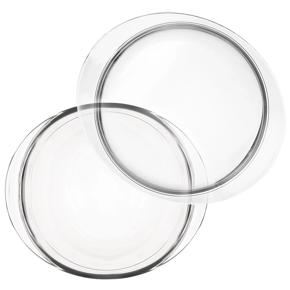 Komplet sestavljata dve okrogli posodi, ki ju lahko uporabljate posamično ali skupaj – ena služi kot pokrov. Integrirani ročaji olajšajo varno prenašanje, pokrov ohranja vlago in toploto med peko. Odporno borosilikatno steklo prenese temperature od -20 °C do +300 °C.