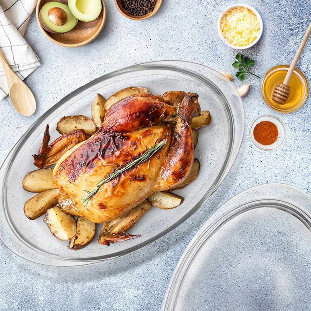Ta ovalna ognjevarna posoda iz borosilikatnega stekla je idealna za pečenje mesa, lazanj, krompirja, zelenjave in gratiniranih jedi. Zahvaljujoč prosojni izvedbi imate nad potekom pečenja vedno popoln nadzor, pripravljen jed pa lahko takoj postrežete na mizo.