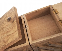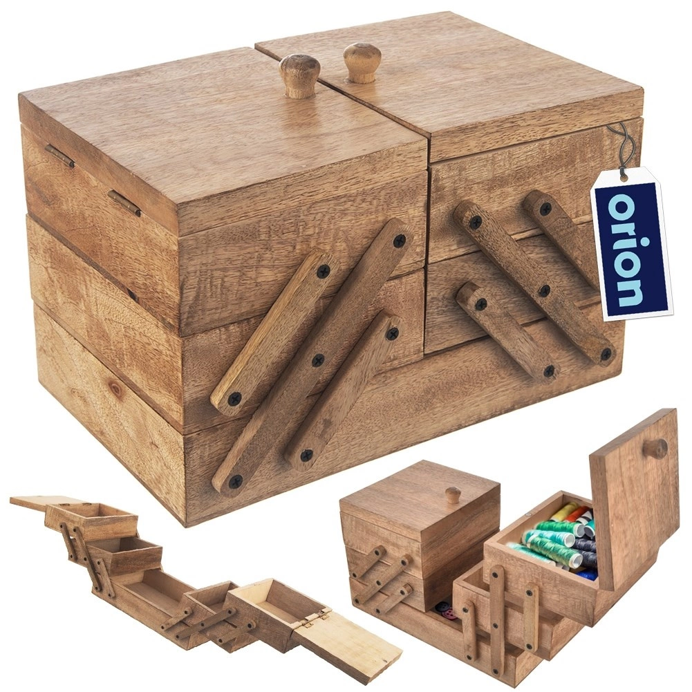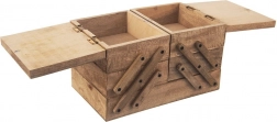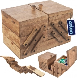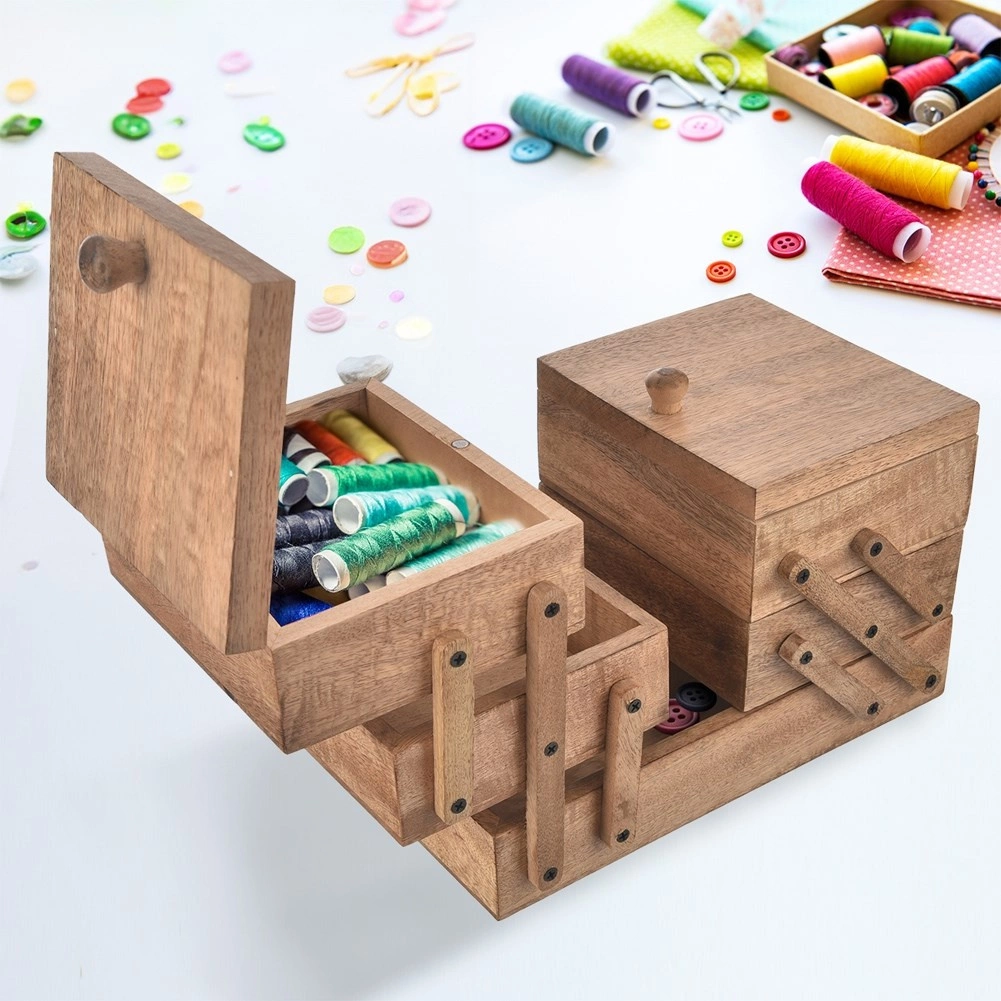 Skrbno obdelan les je ročno izdelan, odporen na vlago in se ne deformira. Dve zgornji pokrovki z lesenimi gumbi zagotavljata hitro in udobno odpiranje. V notranjosti najdete 5 praktičnih predalčkov – štiri kvadratne ob straneh in en velik pravokoten v spodnjem delu – idealno za razporeditev šivalnih potrebščin, perlic ali drobnega orodja.