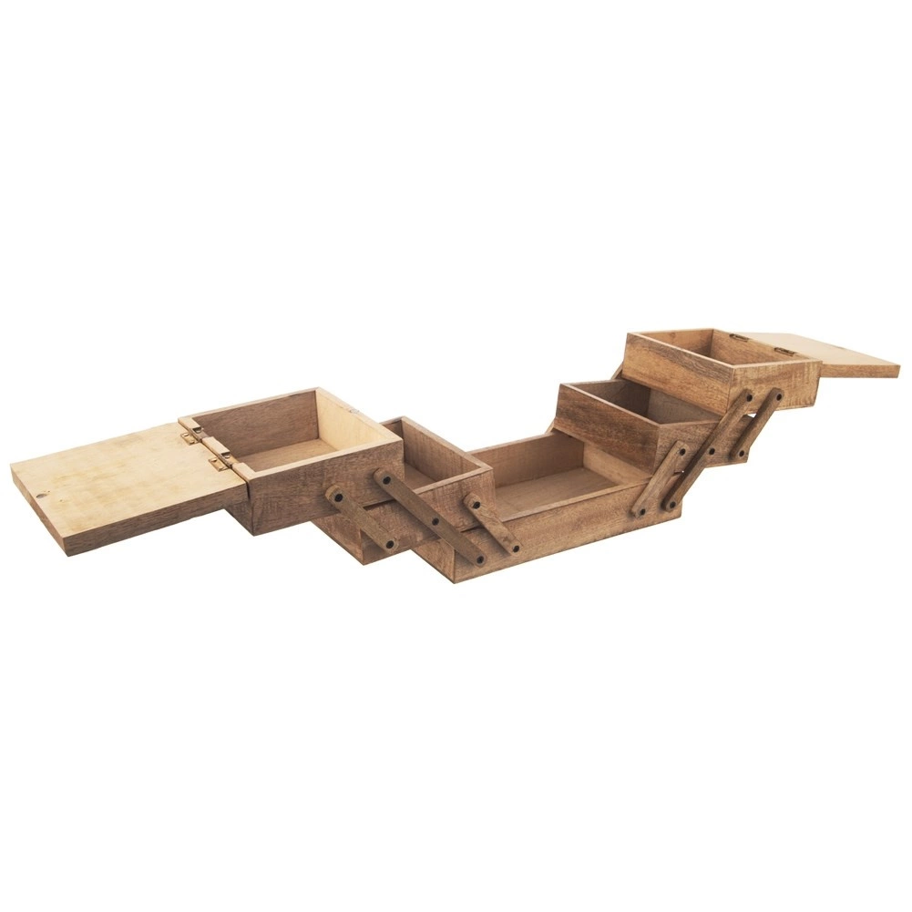 Ta lesena šivalna kaseta iz eksotičnega mangovega lesa bo vaše sukance, igle in drobne šivalne potrebščine ohranila popolnoma organizirane. Zahvaljujoč škarjastemu mehanizmu se gladko raztegne do dolžine 71 cm in omogoča hiter pregled nad vsebino. Naravno obarvan mangov les vašemu ustvarjalnemu kotičku doda eleganten, naraven videz.