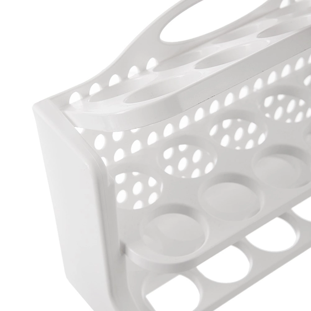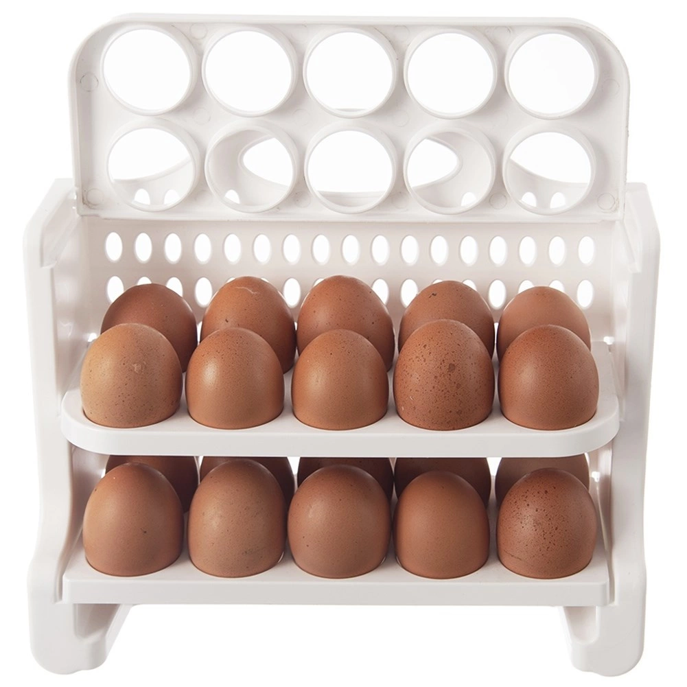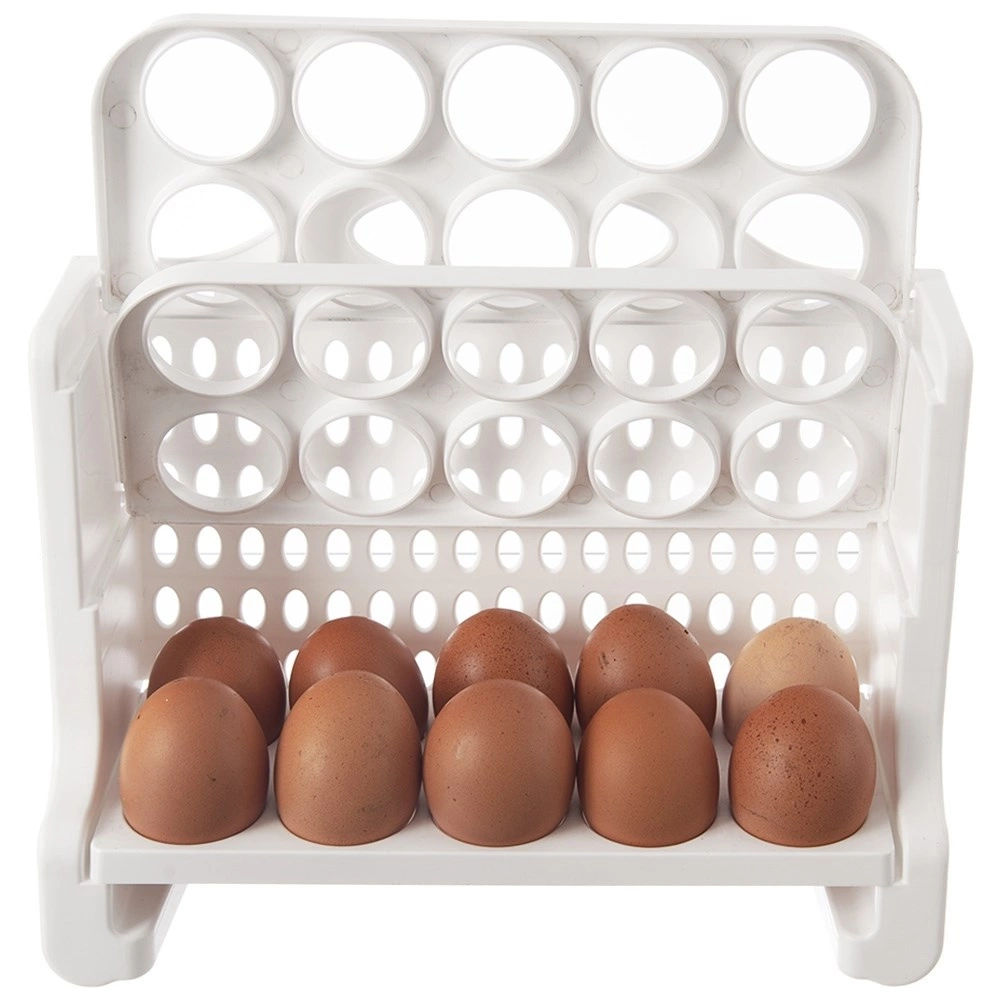 Tri nivoji po 10 kosov držijo jajca pregledno in varno. Idealno za večja gospodinjstva in pogosto peko.