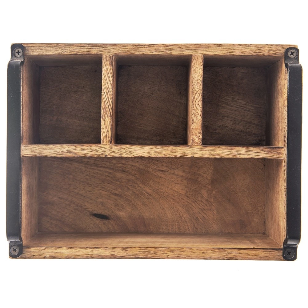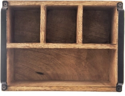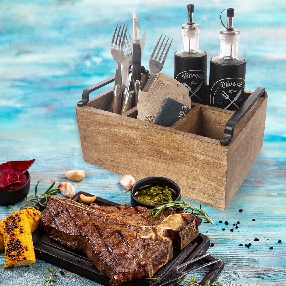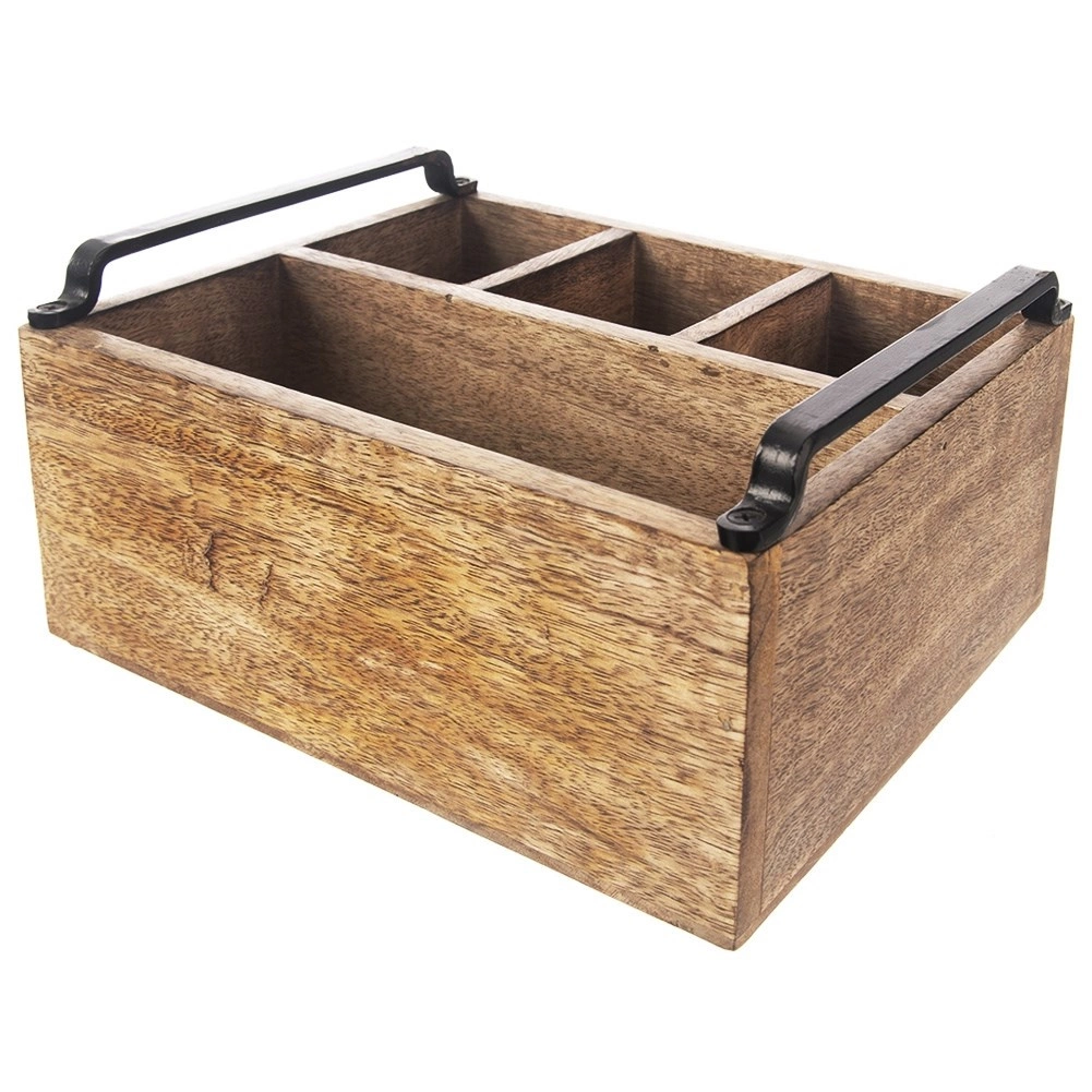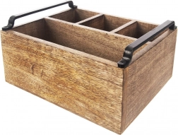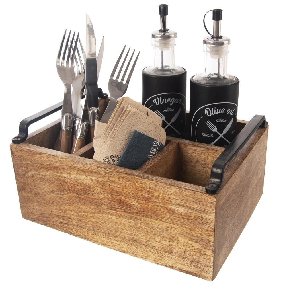 Ta vsestranski namizni organizator v obliki rustikalne lesene škatle pomaga ohranjati red na jedilni mizi in v kuhinji. Štirje premišljeno razdeljeni predelki – trije manjši in en večji – zlahka sprejmejo pribor, začimbnice, steklenice z oljem in kisom, omake ter serviete.