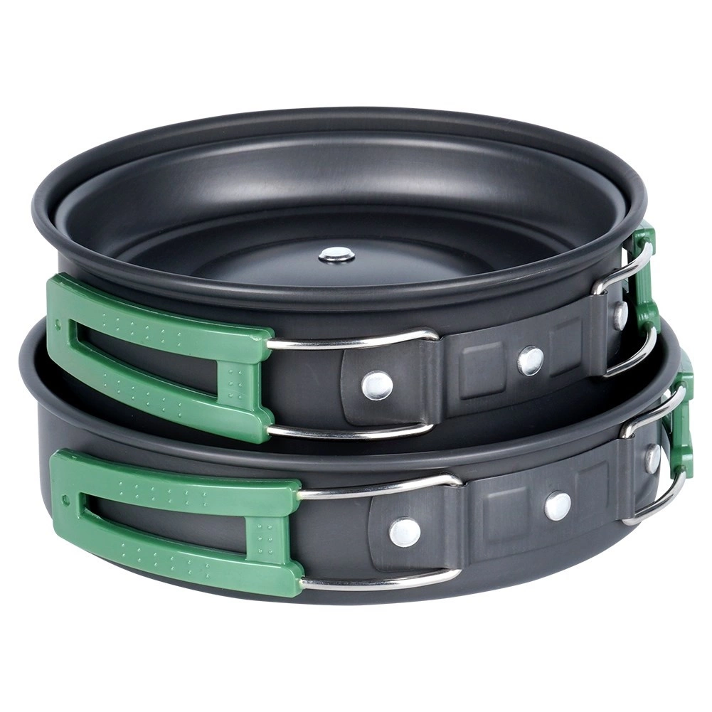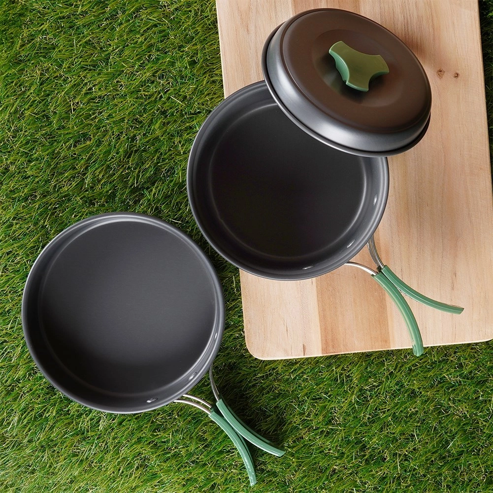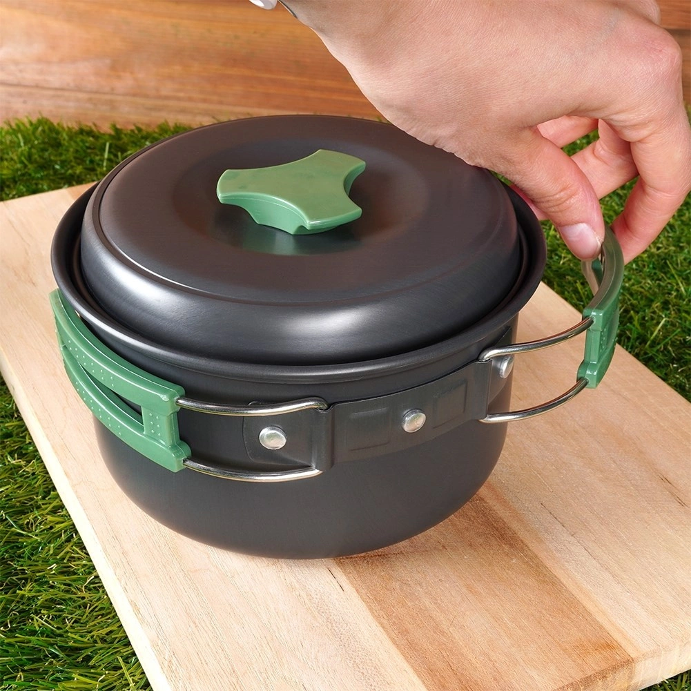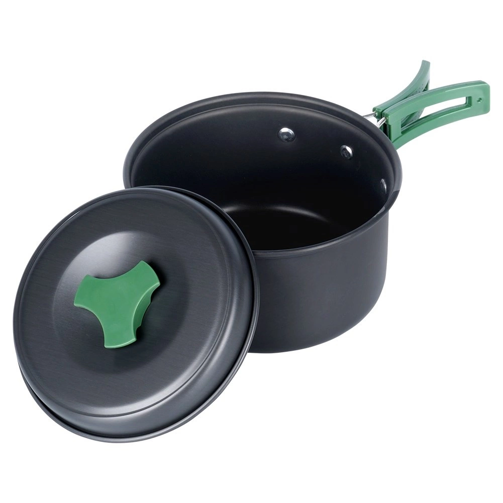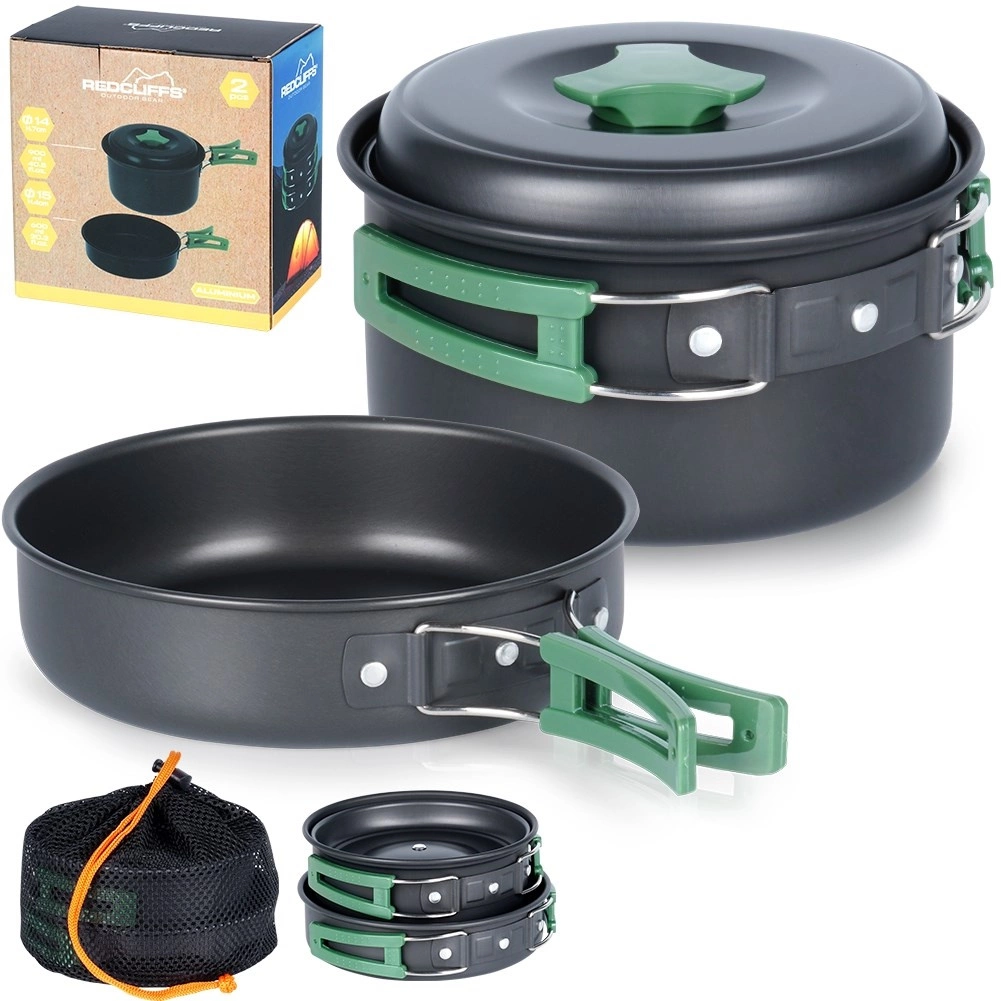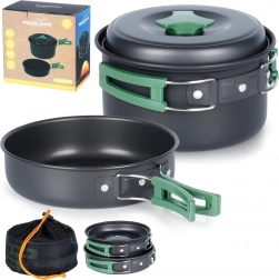 Ta lahek in trpežen komplet posode je idealen za kampiranje, pohodništvo in piknike. Eloksiran aluminij zagotavlja hiter in enakomeren prenos toplote, dolgo življenjsko dobo in enostavno vzdrževanje. Zaradi zložljivih ročajev in zložljive zasnove se celoten komplet spravi v kompakten paket, ki ga zlahka pospravite v nahrbtnik.