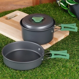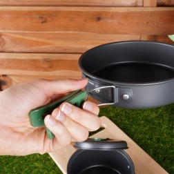 Lonec prostornine 900 ml s pokrovom in ponev prostornine 500 ml pokrijeta večino potreb pri kuhanju na prostem – od vretja vode in juh do cvrtja ter pogrevanja pripravljenih jedi. Komplet je primeren za uporabo na kamp gorilnikih in nad odprtim ognjem, po uporabi pa ga enostavno pospravite v priloženo mrežasto vrečko.