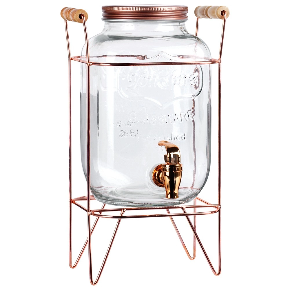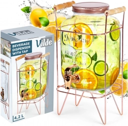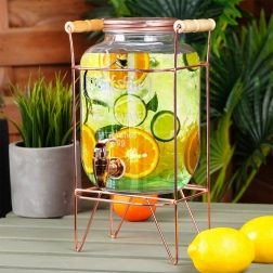 Ta stilski dozirnik združuje kakovostno debelo steklo z dekorativnim reliefnim okrasjem in kovinskim stojalom v odtenku rožnatega zlata z lesenimi ročaji. Dvignjena postavitev posode zagotavlja udobno točenje v kozarce brez premikanja posode. Kovinski navojni pokrov ščiti vsebino pred nečistočami in mrčesom, zato je dozirnik odličen za uporabo na prostem in doma.