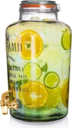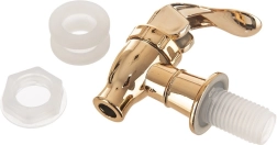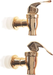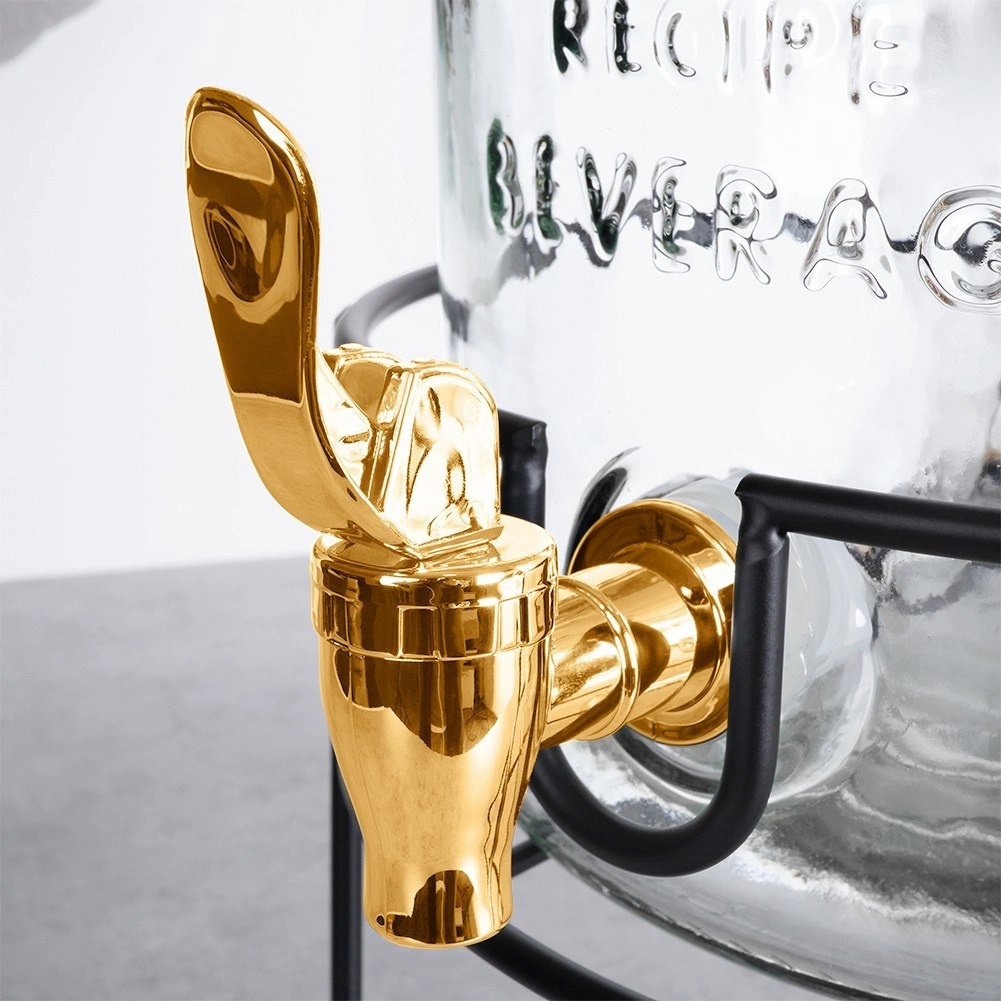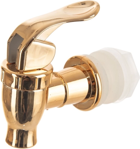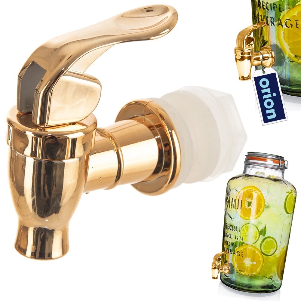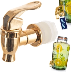Univerzalna velikost in navoj zagotavljata združljivost z večino steklenih posod za limonade, vodo ali domači ledeni čaj. Kovinsko sijoča zlata izvedba doda vašemu pogrinjku premium videz, hkrati pa ponuja udobno upravljanje z ročico za gladko doziranje pijače.