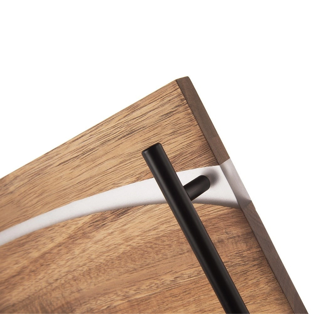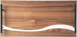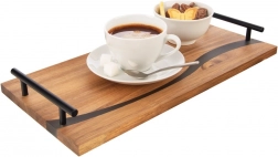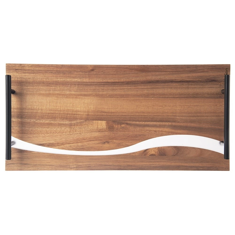 Pravokotni pladenj RIVER združuje naravni akacijev les z dizajnersko smolo, ki ustvari edinstven »rečni« učinek. Zahvaljujoč kovinskim ročajem v črni barvi boste udobno prenesli skodelice, čajnik, kozarce in krožničke. Odličen je za vsakodnevno postrežbo in slavnostne trenutke.