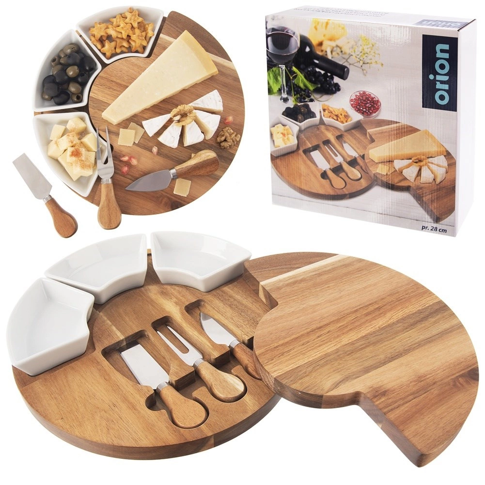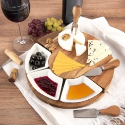 S tremi orodji (nožek, lopatica in vilica) zlahka obvladate mehke, poltrde in trde sire. Tri keramične skledice služijo za dipe, chutney, olive ali oreščke, tako da v hipu ustvarite učinkovito sirno desko. Naravna akacija nudi odpornost in privlačno lesno teksturo, keramika je higienska in enostavna za čiščenje.