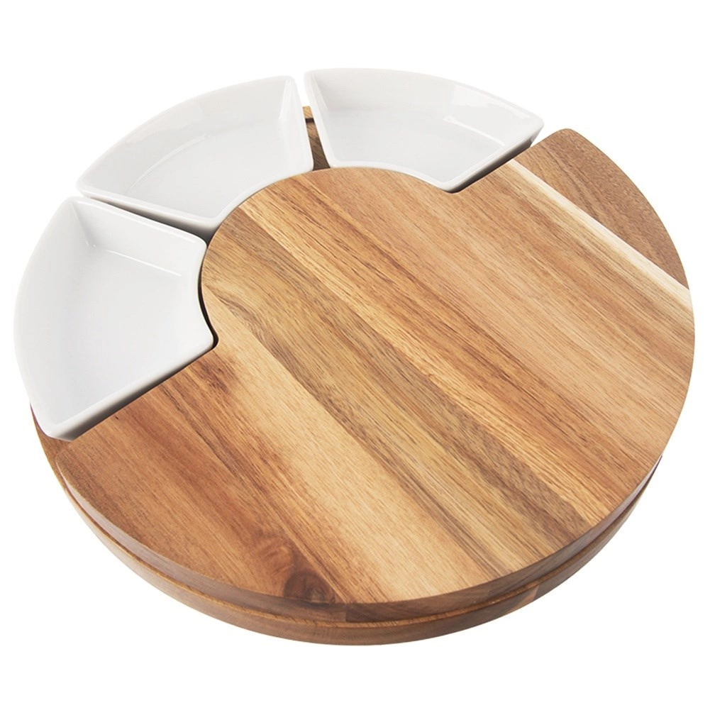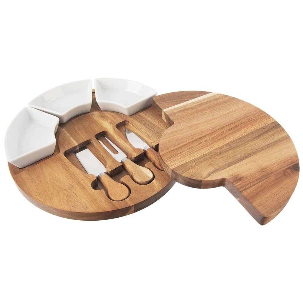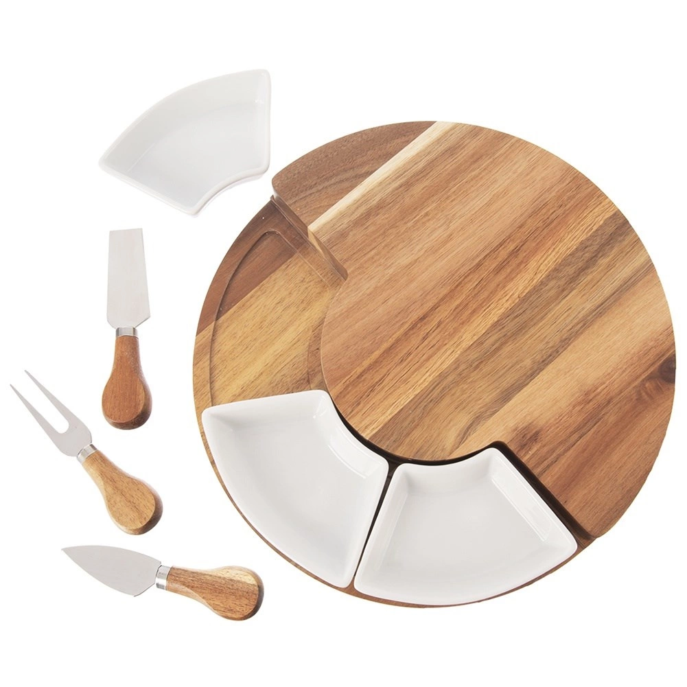 Ta 7-delni komplet za sir združuje naravni akacijev les, nerjavno jeklo in belo keramiko za elegantno serviranje. Vrtljiva/zložljiva deska ustvari več servirnih con in razkrije integriran prostor za nože – vse imate pregledno pri roki. Odlično za družinska praznovanja, srečanja s prijatelji in vsakodnevne dobrote.