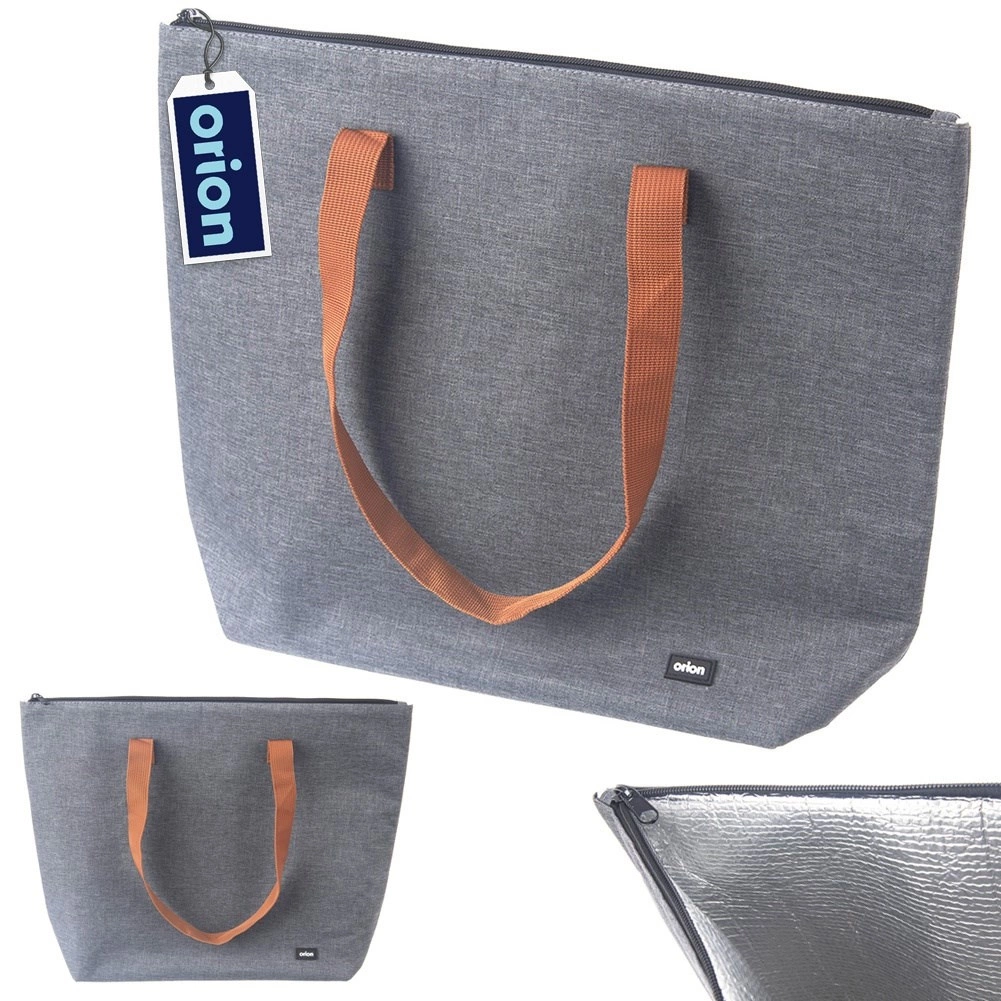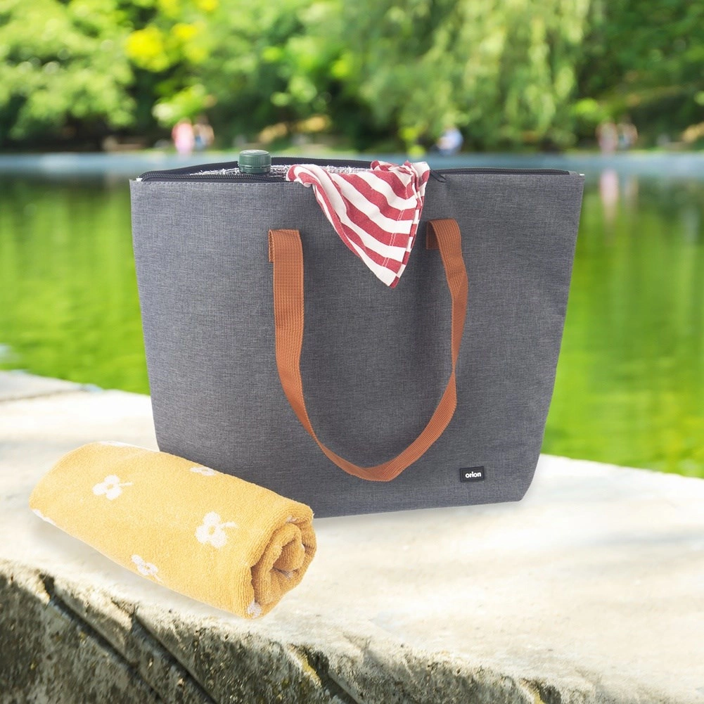 Torba je izdelana iz trpežne poliestrske tkanine, odporne proti obrabi. Sivo telo dopolnjujejo rjavi trakovi dolžine približno 30 cm za udobno nošenje v roki ali čez ramo. Odlična je za plažo, piknik, nakupe in potovanja – poleti pijače in prigrizke ohrani hladne, pozimi pa pomaga ohraniti hrano toplo.