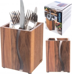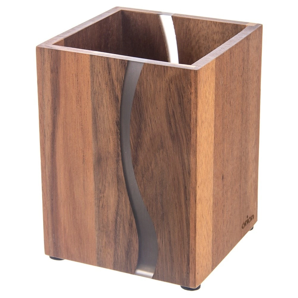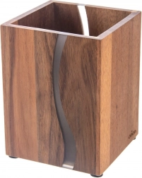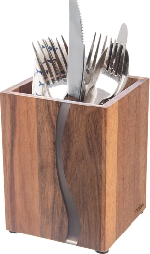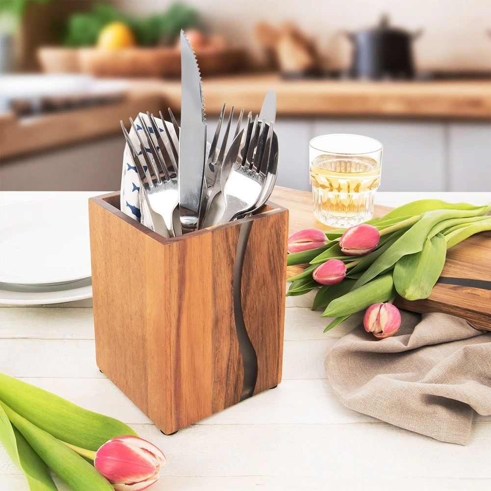 Red na pultu in slog v detajlih. To stojalo iz naravnega akacijevega lesa združuje vzdržljivost, dolgo življenjsko dobo in dekorativni element v obliki valovitega kovinskega/epoksi vložka, ki spominja na reko. Odlično služi za kuhalnice, metlice, škarje, lupilce in vsakdanji pribor, ki bodo vedno pri roki.