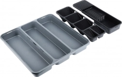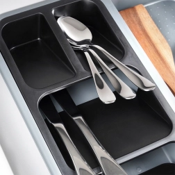 Notranjost sredinskega predalčka je opremljena s protizdrsno površino, ki preprečuje premikanje pribora in pripomočkov. Kakovostna plastika v sivi barvi s črnimi vložki je odporna, enostavna za vzdrževanje in jo je mogoče pomivati v pomivalnem stroju. Idealni dodatek za vsako kuhinjo, ki prihrani prostor in pospeši vaše kuhanje.