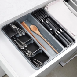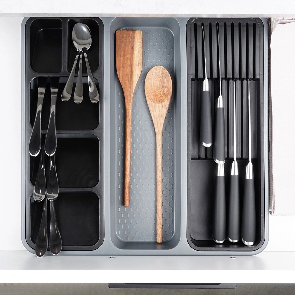 Uredite svojo kuhinjo v hipu. Ta siv organizator z merami 40 × 40 × 5 cm ponuja pametno razporeditev predalčkov, vključno z odstranljivimi vložki – eden je namenjen za do 9 nožev, drugi za pregledno razvrščanje pribora. Tako bo vsak kos ostal na svojem mestu in v predalu bo vedno red.