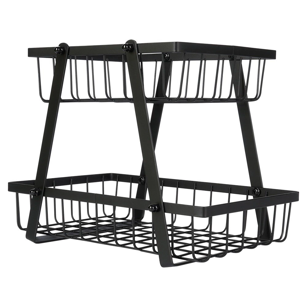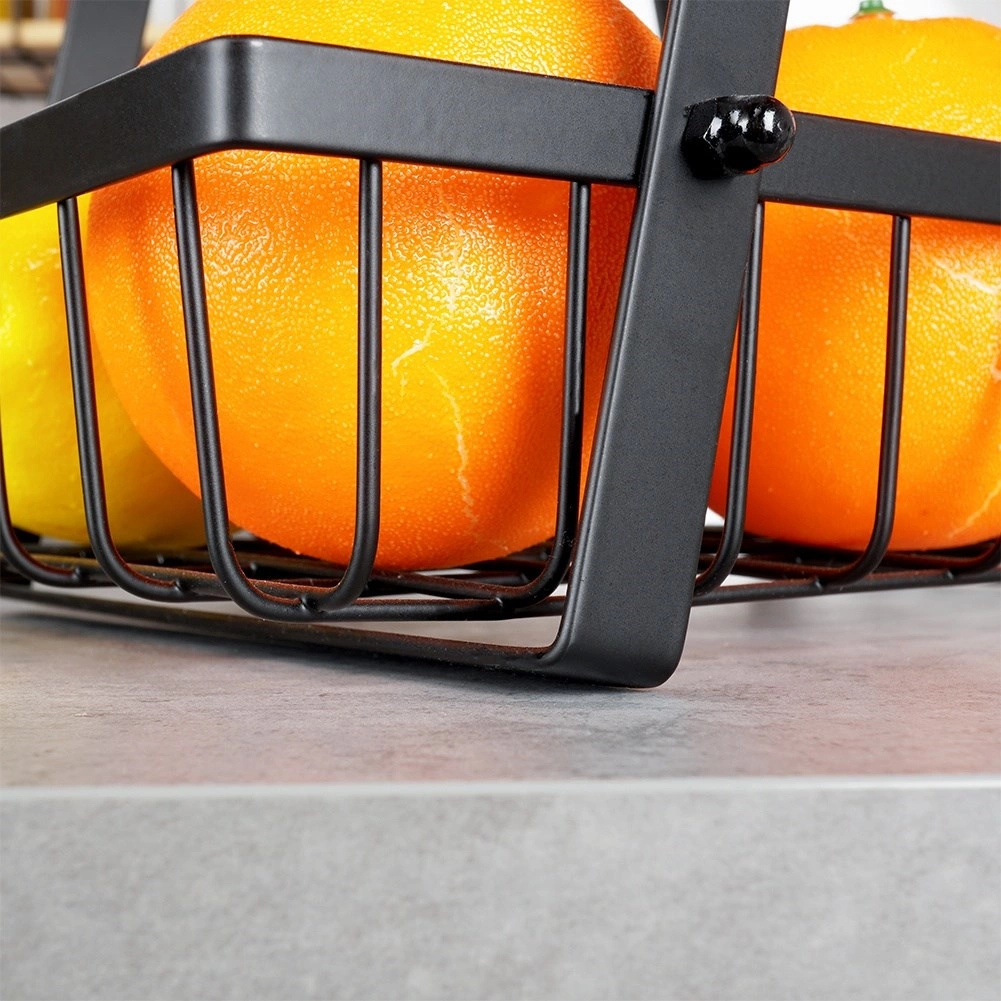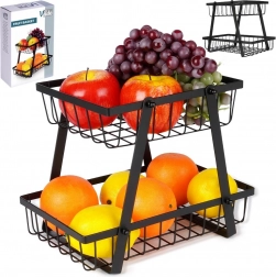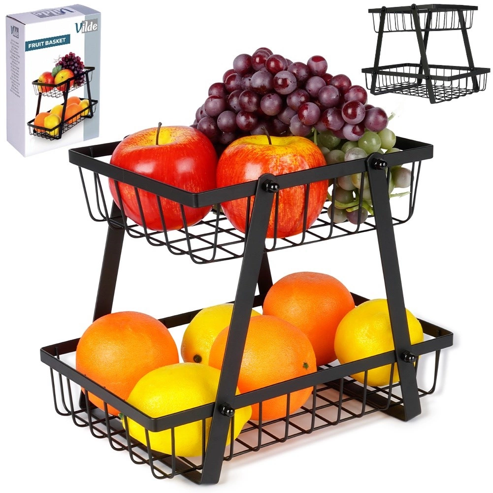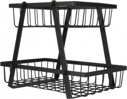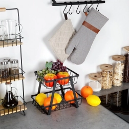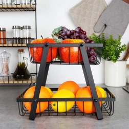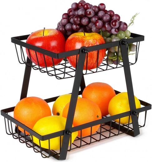 Slogoven in praktičen pomočnik za vsako kuhinjo: dvonivojski stojalo z žičnatimi košarami v industrijskem loft slogu prihrani prostor in hkrati lepo razstavi vaše sadje in zelenjavo. Odprte stranice spodbujajo kroženje zraka, zato pridelki ostanejo dlje časa sveži in pregledni.