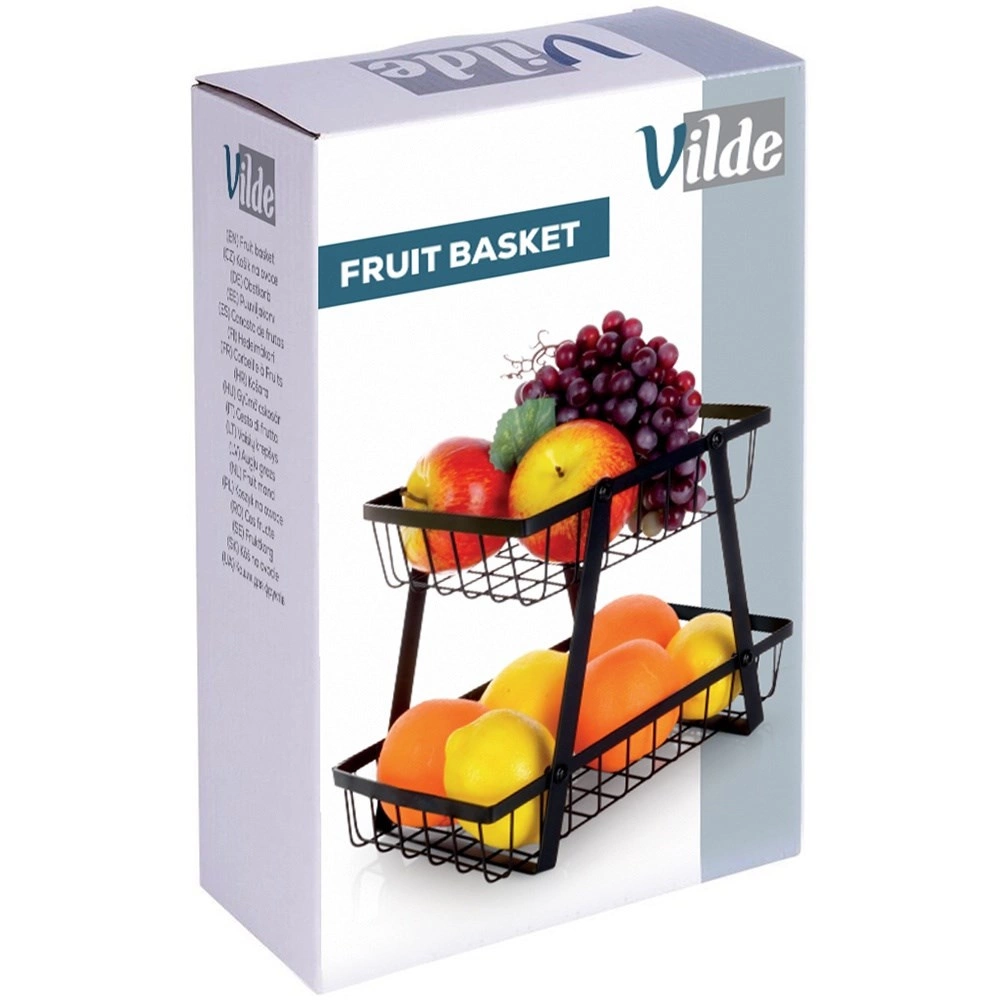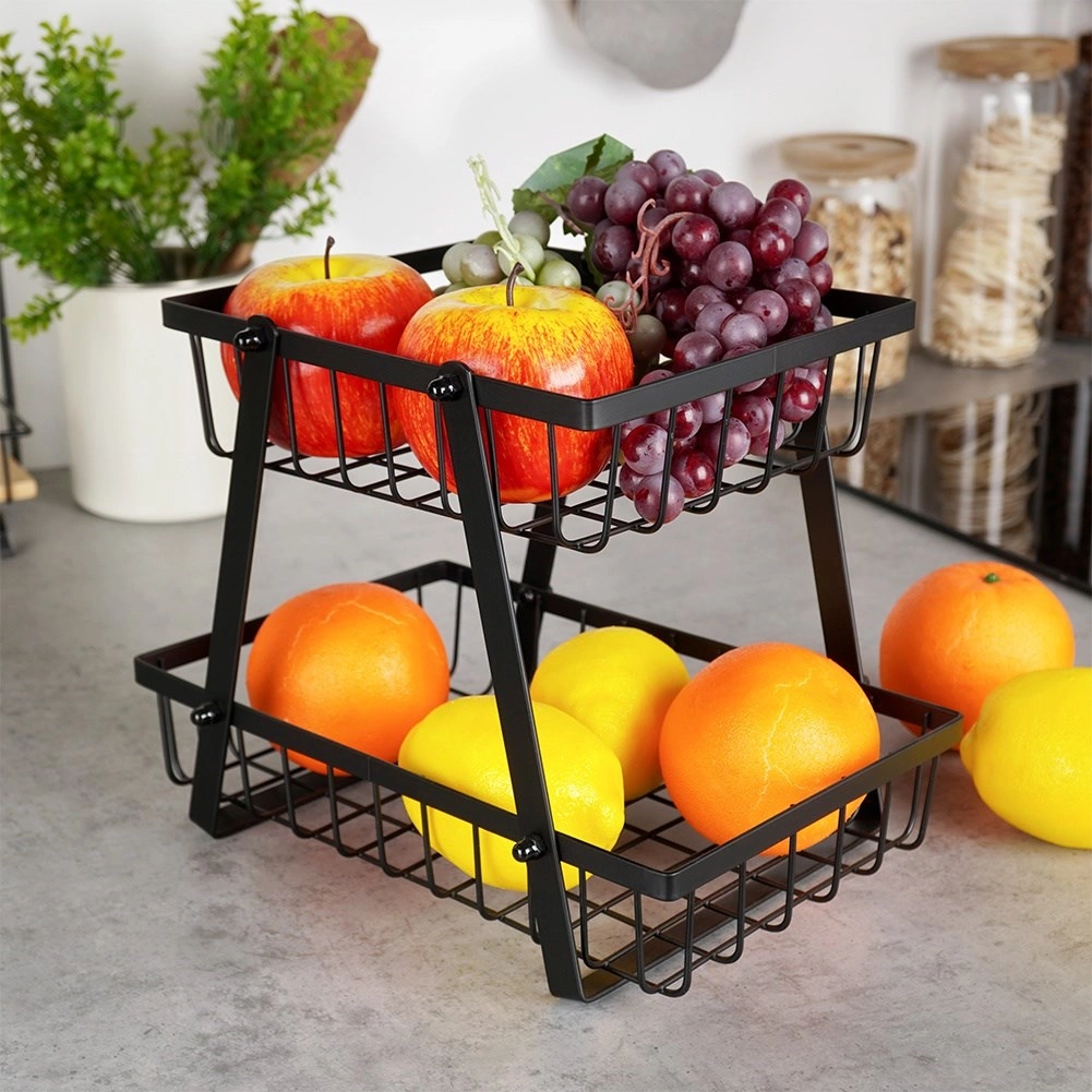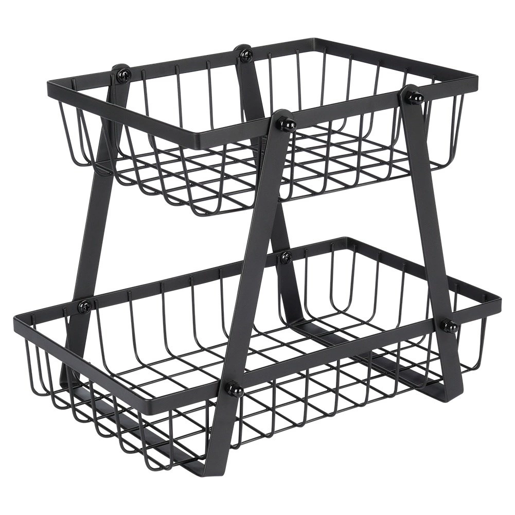 Slogoven in praktičen pomočnik za vsako kuhinjo: dvonivojski stojalo z žičnatimi košarami v industrijskem loft slogu prihrani prostor in hkrati lepo razstavi vaše sadje in zelenjavo. Odprte stranice spodbujajo kroženje zraka, zato pridelki ostanejo dlje časa sveži in pregledni.