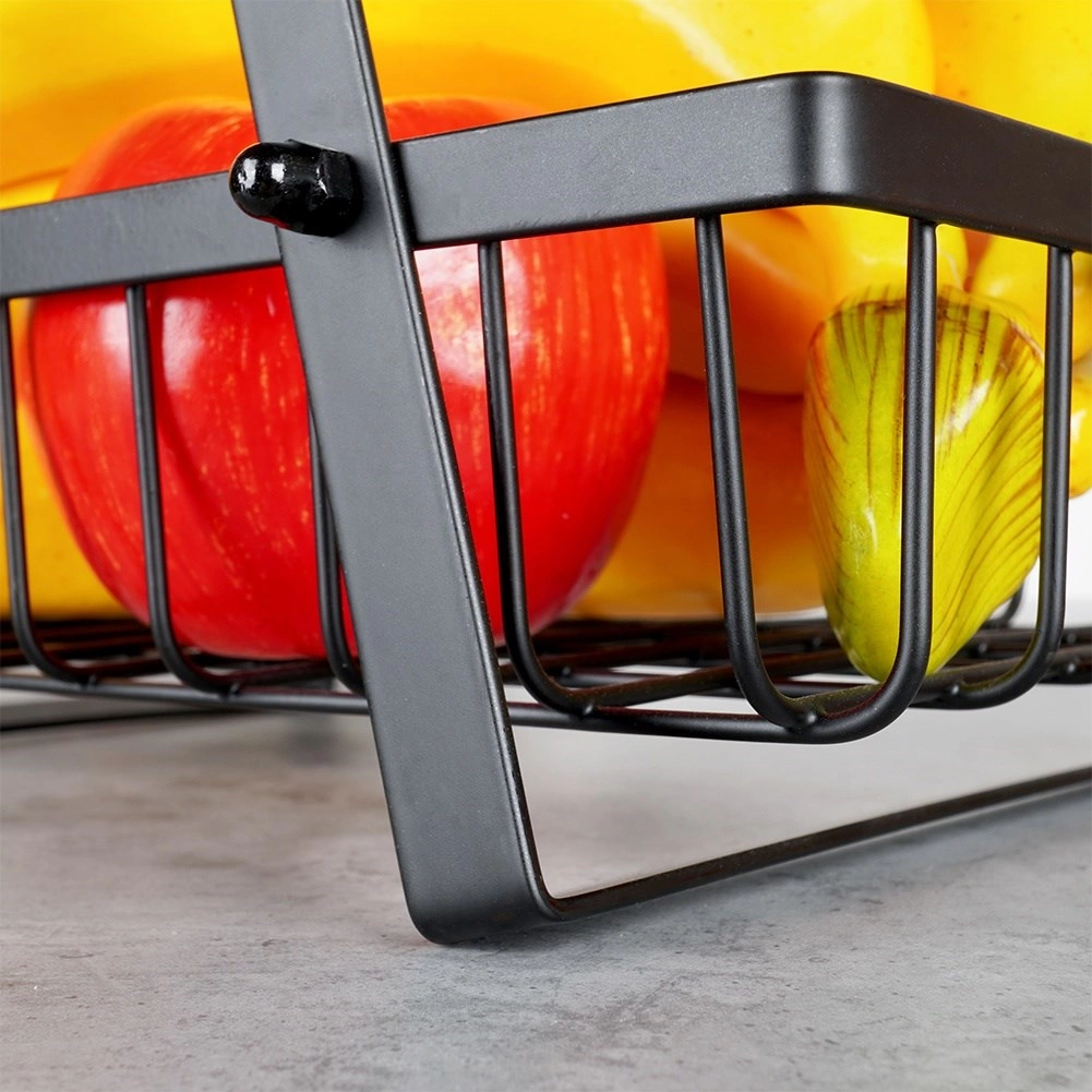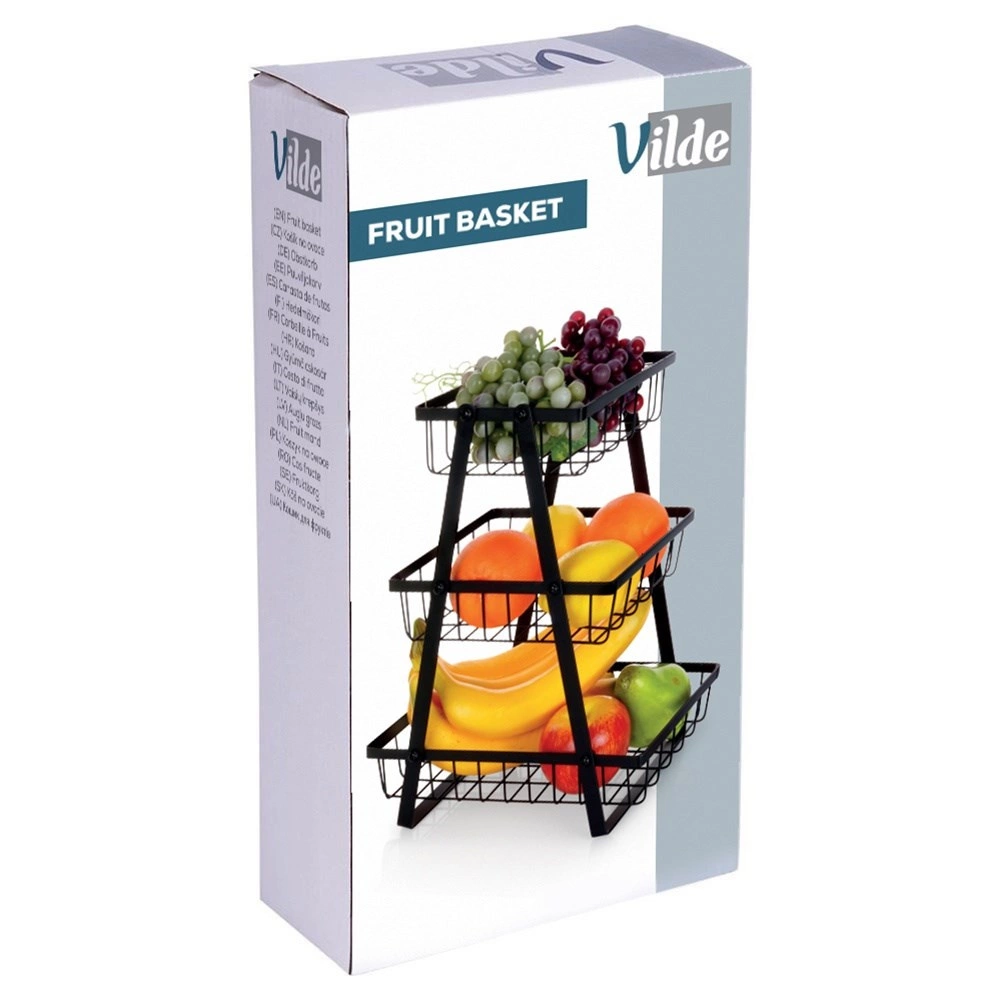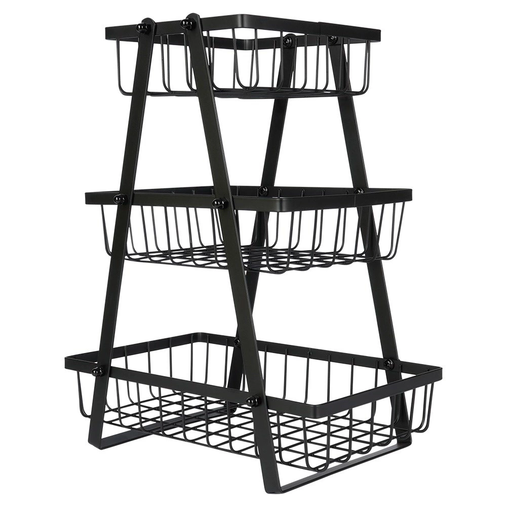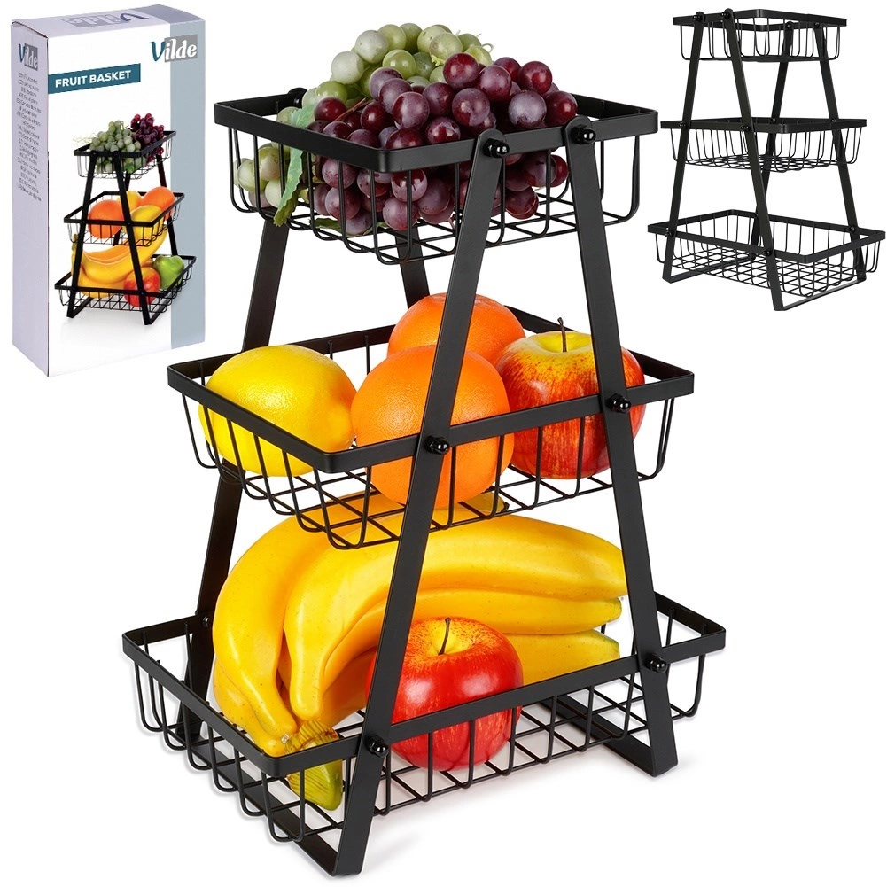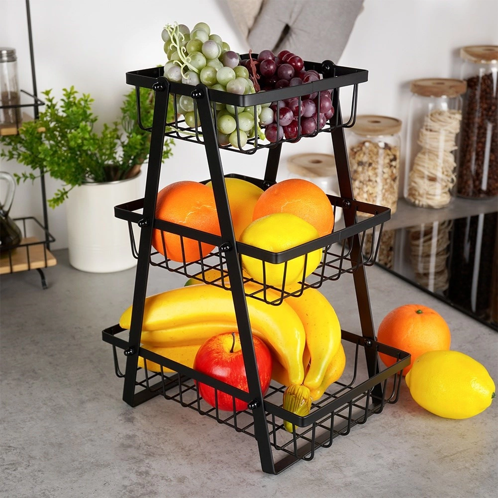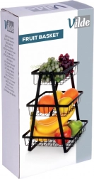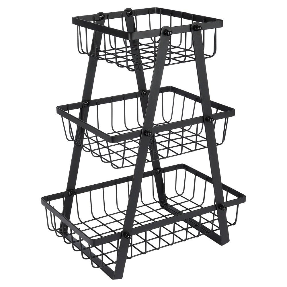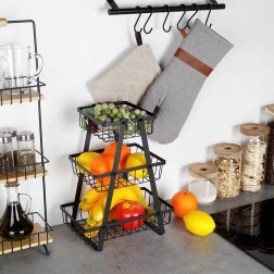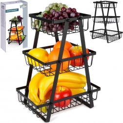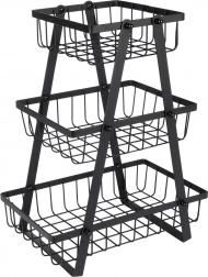 To trietažno stojalo za sadje je idealna rešitev za organizirano in stilsko shranjevanje sadja, zelenjave ali drobnarij v kuhinji. Stabilen A‑okvir in trdne kovinske košare z odprtimi stenami zagotavljajo odličen pregled in dostop do vsebine, hkrati pa podpirajo pretok zraka, da živila ostanejo dlje časa sveža.