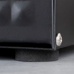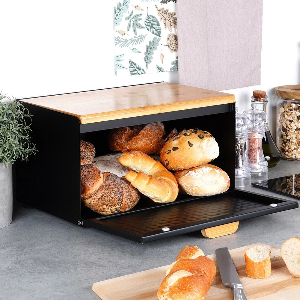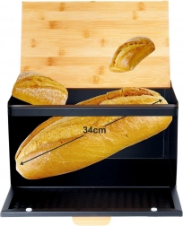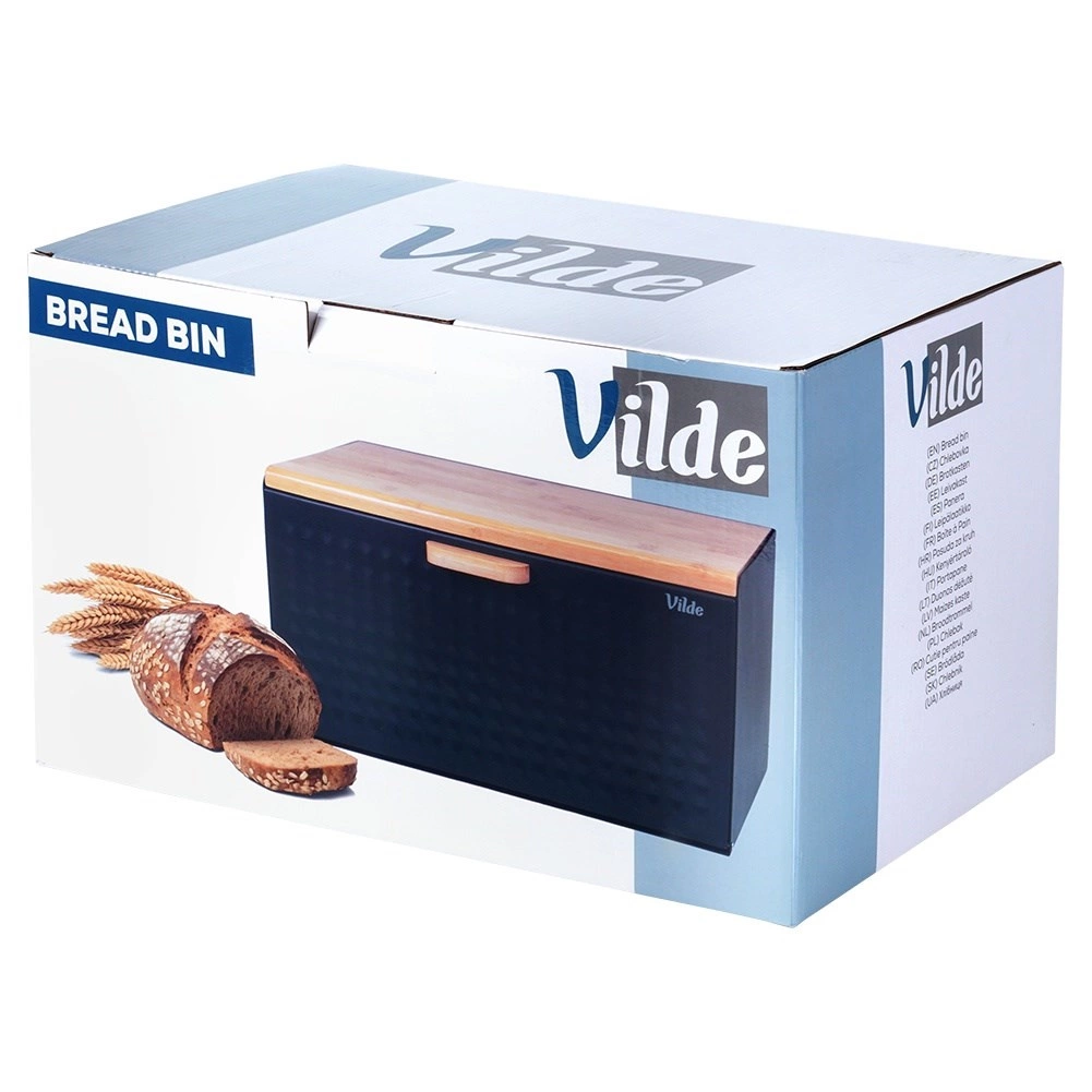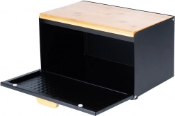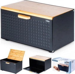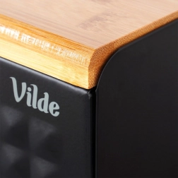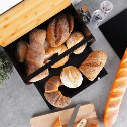 Dekorativna struktura površine in kombinacija črne z lesom poudarjata eleganten videz. Zgornja plošča lahko služi kot deska za rezanje – vse imate pri roki. Posoda je dovolj prostorna za kruh, žemlje, bagete in sladko pecivo, filc podloge pa ne bodo opraskale delovnega pulta.