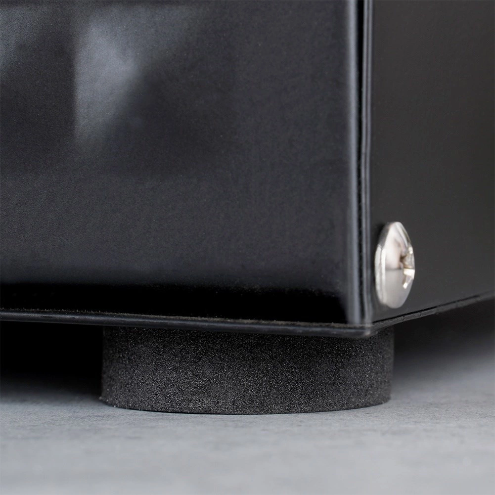 Praškasto lakirana kovina v črni barvi z teksturirano čelno stranjo in lesenim ročajem zagotavlja trpežnost in eleganco. Protidrsne podloge ščitijo delovni pult.