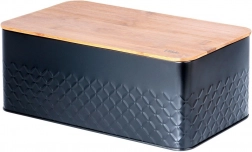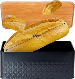 Slogovni zaboj za kruh združuje odporno, praškasto lakirano kovinsko ohišje v mat črni barvi z naravnim bambusnim pokrovom. Pokrov lahko uporabite kot praktično desko, zato kruh narežete kar tam, kjer ga hranite. Dizajn z reliefno teksturo daje zaboju moden videz in se zlahka vključi v minimalistične ali naravno zasnovane kuhinje.