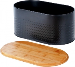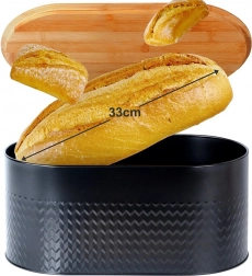 Moderen zaboj za kruh s kovinskim ohišjem iz kakovostnega ogljikovega jekla, lakiranega v mat črno, ter z izrazito teksturirano površino. Pokrov iz naravnega lesa služi kot praktična rezalna deska, zato imate vse pri roki – od shranjevanja do serviranja.