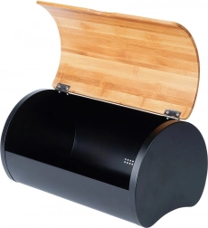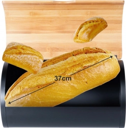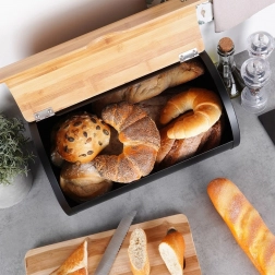 Sodoben zaboj za kruh združuje mat črno kovinsko ohišje in pokrov iz naravnega bambusa za brezčasen videz ter zanesljivo zaščito peciva. Zahvaljujoč premišljenemu zapiranju ostanejo kruh, žemlje in sladko pecivo dlje mehki in okusni.