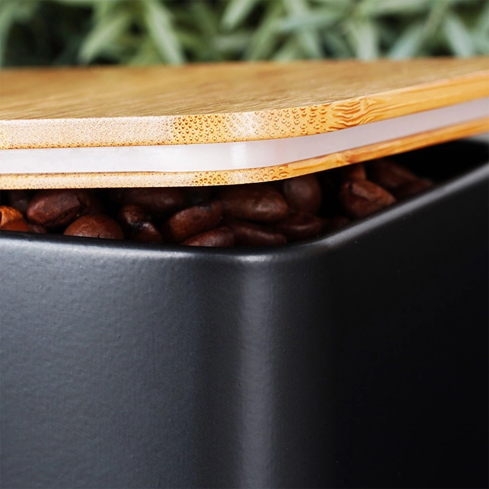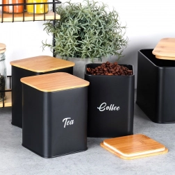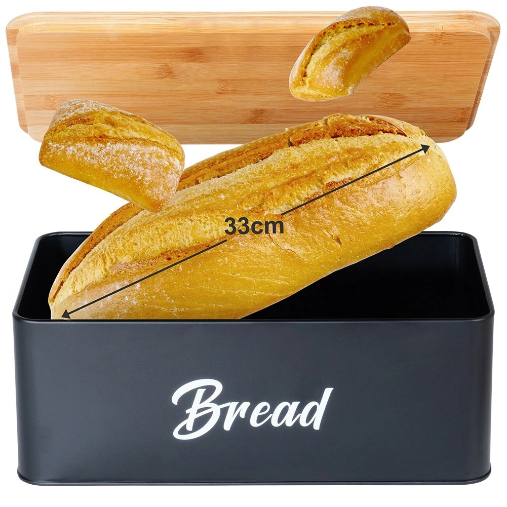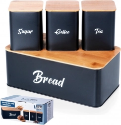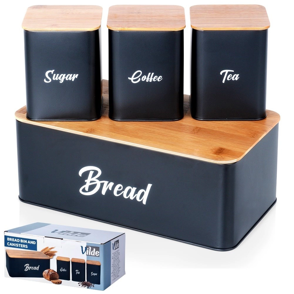 Zaboj za kruh iz trpežne kovine, lakirane s praškasto barvo, izstopa s čistimi linijami in praktičnim pokrovom iz bambusovega lesa, ki ga lahko uporabite kot rezalno desko. Kovinska konstrukcija ščiti pekovske izdelke pred mečkanjem in zmanjšuje izsuševanje. Tri usklajene posode z bambusovimi pokrovi ohranjajo sladkor, kavo in čaj dlje aromatične in pregledno shranjene.