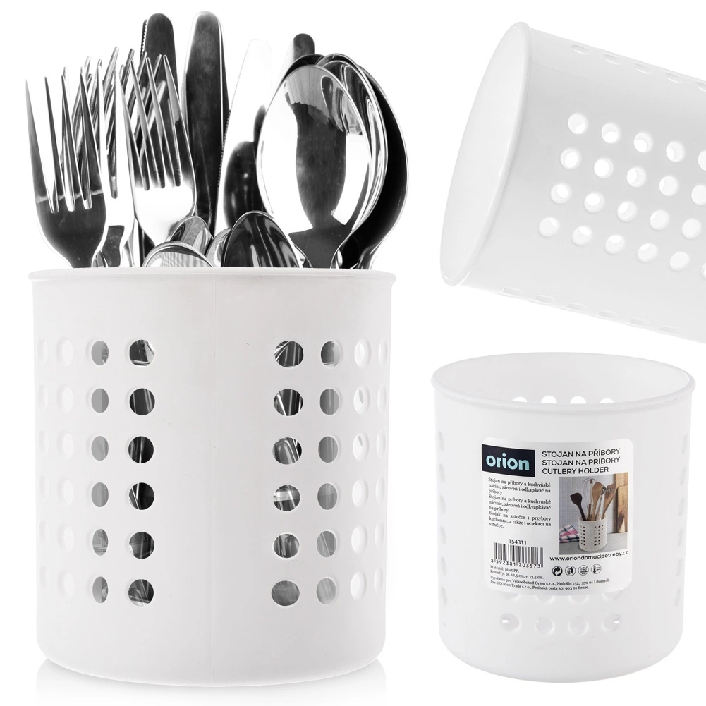 Ohranite kuhinjo urejeno z univerzalnim stojalom, ki služi kot odcejevalnik za jedilni pribor in organizator kuhinjskih pripomočkov. Perforacije po celotnem obodu in na dnu pomagajo odvajati vlago, zato se žlice, vilice, noži in metlice hitreje sušijo in ostanejo higiensko shranjeni.