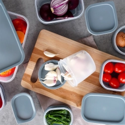 Posode so izdelane iz odporne in zdravstveno neoporečne plastike v prozorni izvedbi s sivimi pokrovi. Odlično so primerne za suhe sestavine, narezke, solate, sadje, zelenjavo, pripravljena jedi in prigrizke, pa tudi za drobne kuhinjske pripomočke. Enostavno vzdrževanje – primerne za pomivalni stroj, varne za zamrzovalnik in hladilnik.