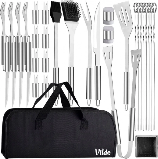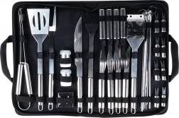 Vsebina kompleta: 1× lopatica (35 cm), 1× klešče (34,5 cm), 1× vilica (35 cm), 1× nož (32 cm), 1× čopič s silikonskimi ščetinami (34 cm), 8× raženj (35 cm), 1× posodica za sol (3,5 × 5,5 cm), 1× posodica za poper (3,5 × 5,5 cm), 1× ščetka za žar s strgalom (34 cm) + 1× nadomestna glava, 8× držalo za koruzo (7 cm), 4× namizna vilica (21 cm), 4× namizni nož (24 cm), 1× torba.