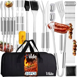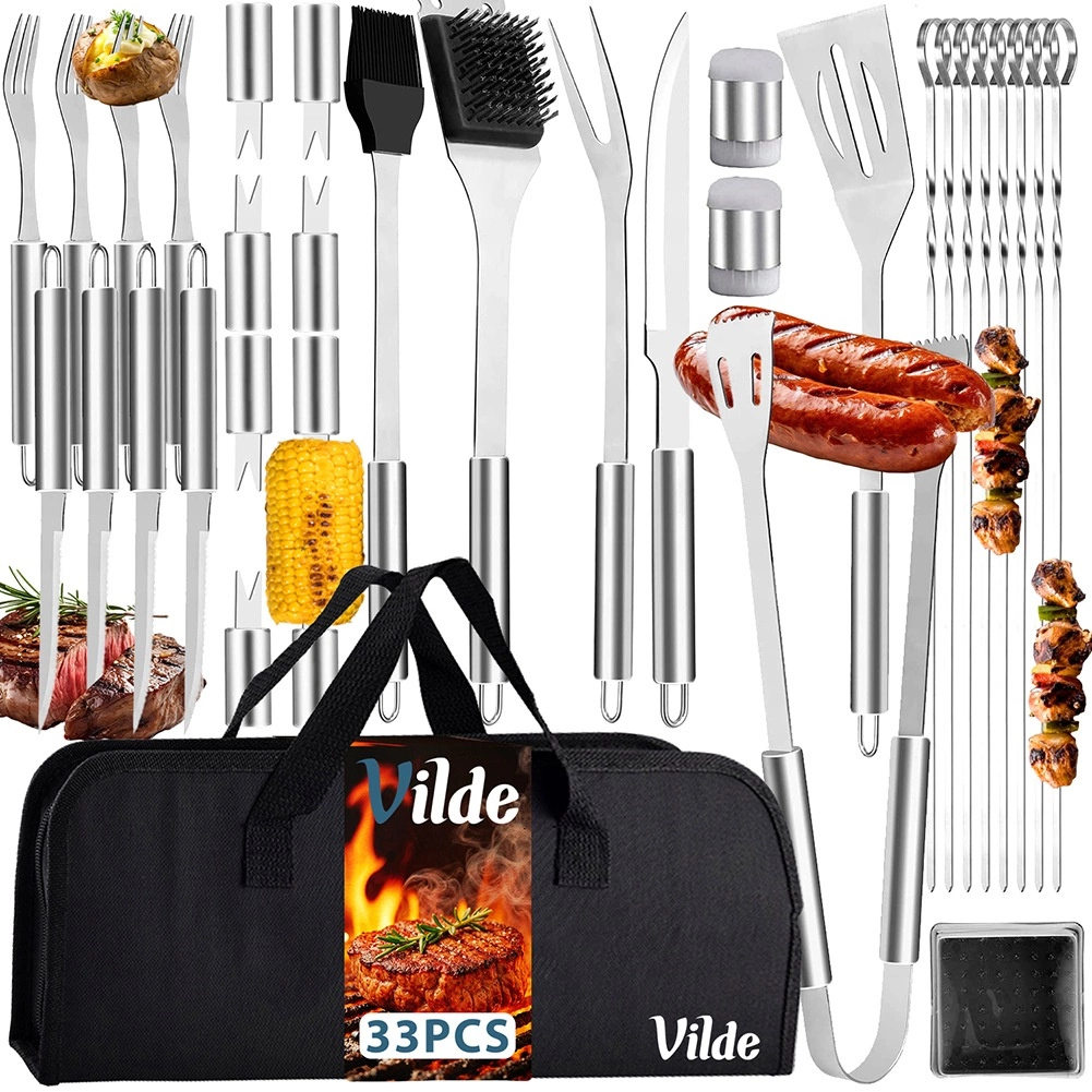 Ta univerzalni komplet žarnega pribora ponuja 33 skrbno izbranih delov iz nerjavečega jekla za vsakodnevno pečenje doma ali na poti. Dolgi ročaji z očescem za obešanje zagotavljajo varno razdaljo od vročine in udobno rokovanje. Praktična tekstilna torba s čvrstimi ročaji olajša shranjevanje in prenašanje, zato imate vse vedno pri roki in pregledno organizirano.