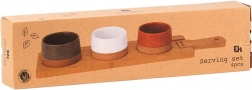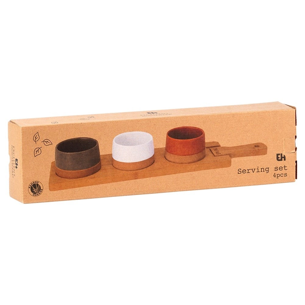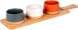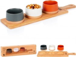 Ta elegantni set skledic z bambusovo desko je idealen za serviranje prigrizkov, antipasti, pomak in omak. Zaradi frezanih ležišč za skledice vse ostane stabilno tudi med prenašanjem. Minimalističen dizajn izstopa v modernem in tradicionalnem domu ter je odlična ideja za darilo ob vselitvi.