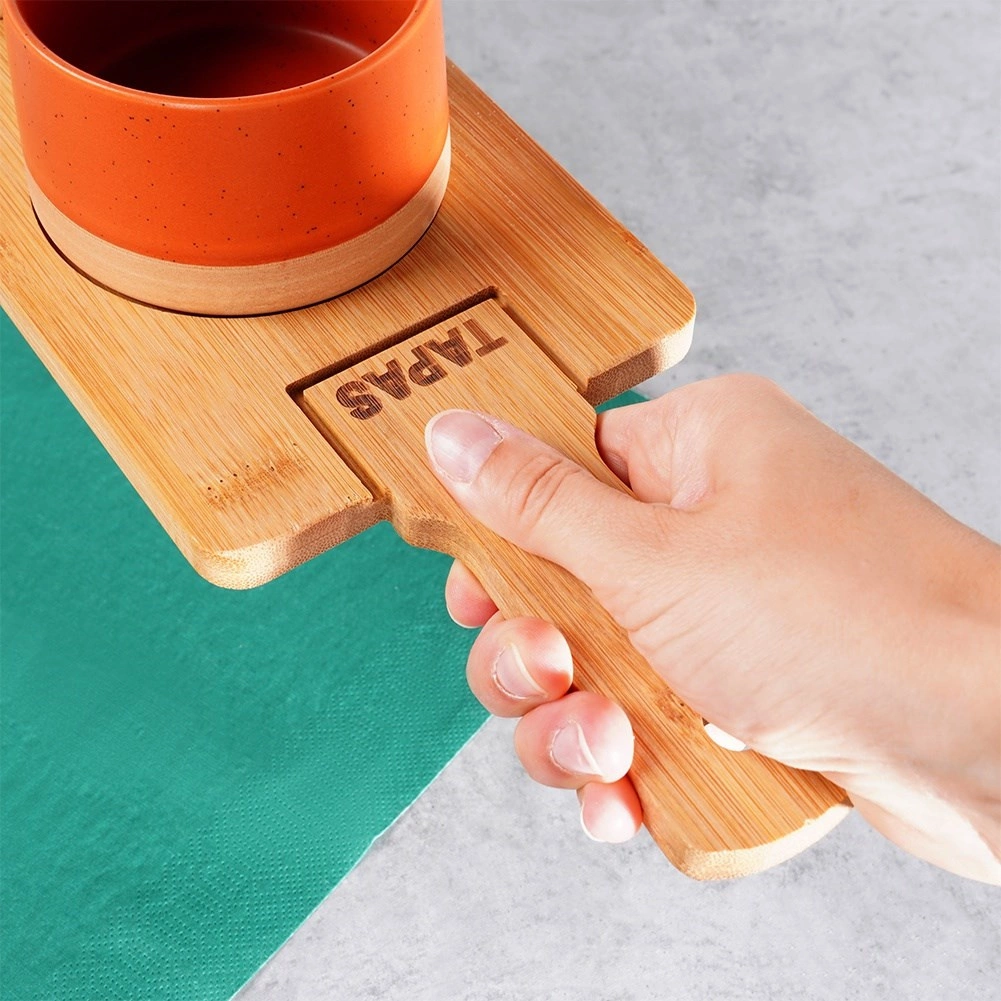 Podlaga iz naravnega bambusa z namensko izrezanimi mesti za skledice zagotavlja stabilnost pri serviranju in prenašanju ter doda mizi naraven pridih.
