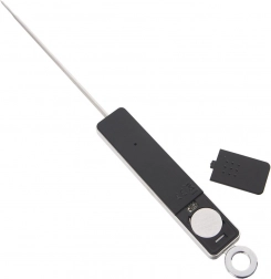 Vzdržljiva zasnova združuje nerjaveče jeklo in čvrsto plastično ohišje v črni barvi. Praktičen zaščitni pokrov sonde olajša varno shranjevanje in potovanja, ušesce omogoča obešanje v kuhinji. Napajanje zagotavlja 1× baterija CR2032 (ni priložena).