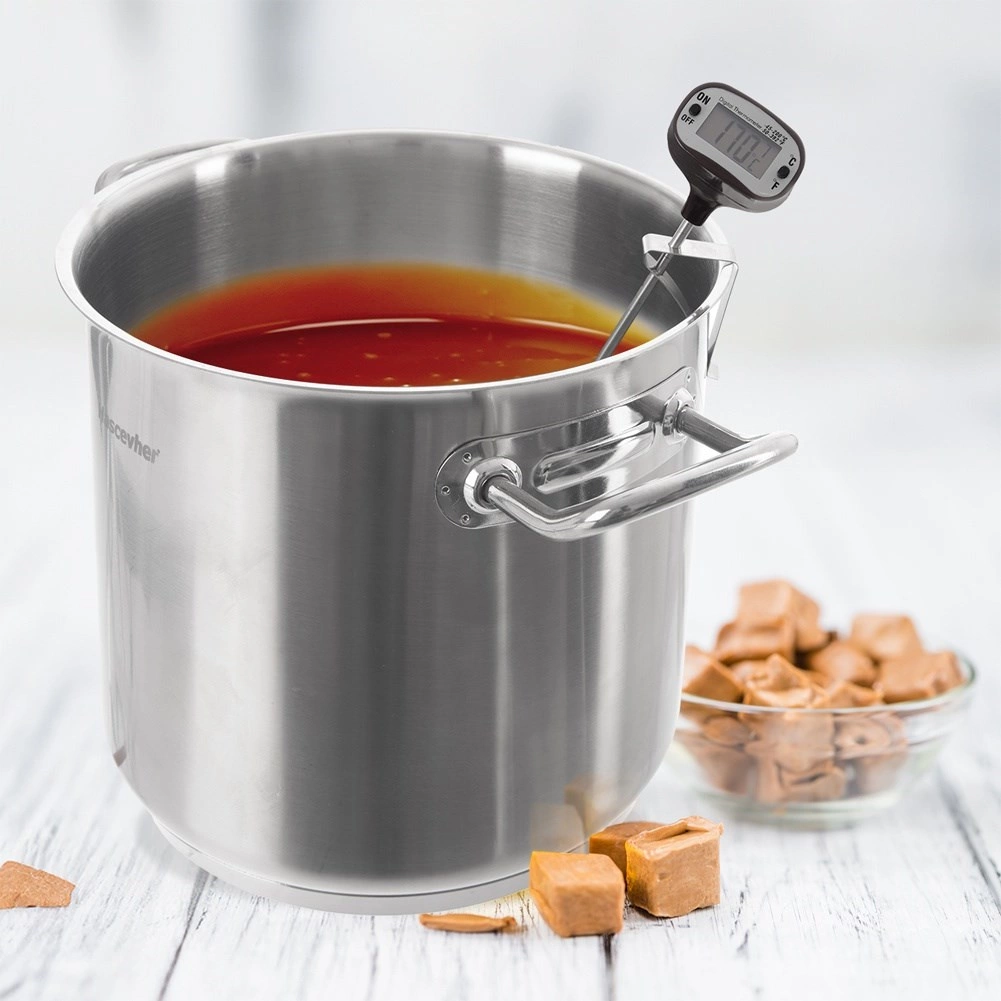 Vzdržljiva sonda iz nerjavnega jekla zagotavlja natančno merjenje v notranjosti jedi. Praktična sponka drži termometer na robu posode brez držanja v roki.