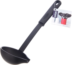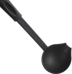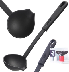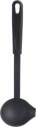 Praktična kuhinjska zajemalka s prostornino 60 ml in dolžino 29 cm iz odpornega termoplasta v elegantni črni barvi. Zahvaljujoč stranskemu izlivu omogoča natančno serviranje juh, omak in golažev brez polivanja. Je zelo lahka, udobno se drži, ima odprtino za obešanje in je primerna za pomivalni stroj. Toplotna odpornost do 200 °C in brezčasen dizajn linije BLACKLINE.