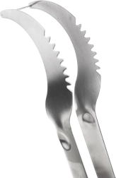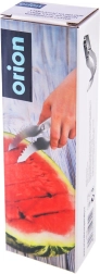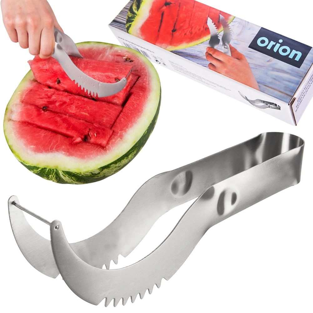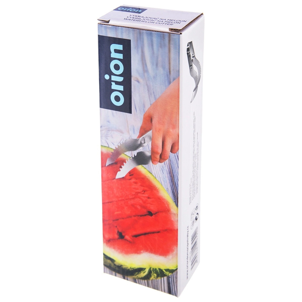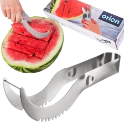 Uživajte v poletju brez napora – nerjavni rezalnik za lubenico ORION združuje funkcijo noža in klešč v enem. Ukrivljeno telo z nazobčanim rezilom ustvarja čiste reze, medtem ko prožna konstrukcija omogoča, da končane kose preprosto primete in prenesete na krožnik. Idealno za hitro pripravo enakomernih kock ali palčk iz lubenice in drugih melon.