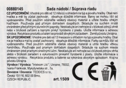 Set vsebuje vse potrebno za malo čajanko: čajnik, skodelice s krožnički ter žličke v veselih barvah. Pakirano v praktični mrežasti vrečki, ki olajša shranjevanje in prenašanje. Primerno od 12 mesecev.