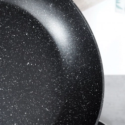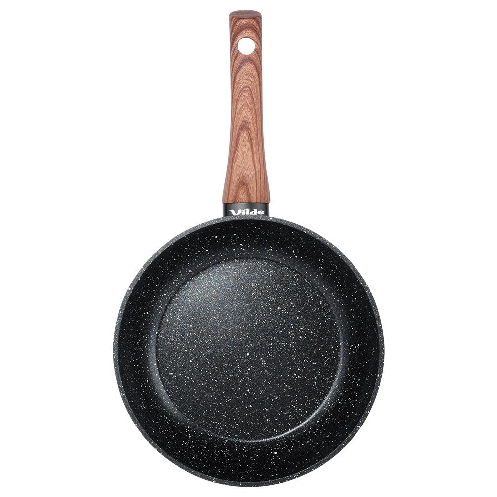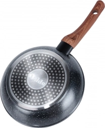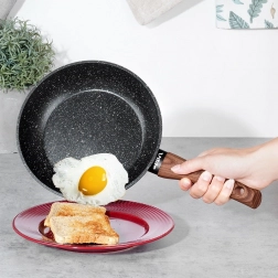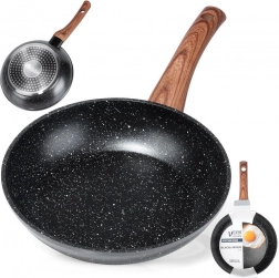 Stilna ponev v moderni kombinaciji črne in lesa je idealna za vsakodnevno pečenje in dušenje. Trpežen aluminijast ulitek se hitro segreje, granitna neprijemljiva plast pa poskrbi za enostavno sproščanje jedi brez prijemanja – zadostuje kapljica olja.