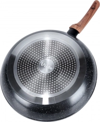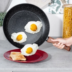 Odkrijte univerzalno ponev BLACK & WOOD, ki združuje trpežen aluminijast ulitek in sodobno granitno neprijemljivo površino. Zaradi velikega premera 32 cm zlahka pripravi porcije za vso družino, in to z minimalno količino olja. Stilska črna zasnova z lesenim dekorjem se odlično poda v vsako kuhinjo.