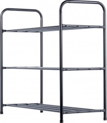 To tridelno kovinsko stojalo za čevlje poskrbi za red in pregled v vašem domu. Odprta konstrukcija s cevnatimi rešetkami omogoča kroženje zraka ter ohranja obutev prezračeno in hitro dostopno. Robusten okvir iz prašno lakirane kovine v črni mat barvi je stabilen in vzdržljiv, hkrati pa lahek za enostavno prestavljanje.
