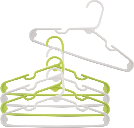 Lahek plast v beli in zeleni barvi se ne deformira, obešalnike pa je mogoče enostavno zložiti enega na drugega za prihranek prostora.
